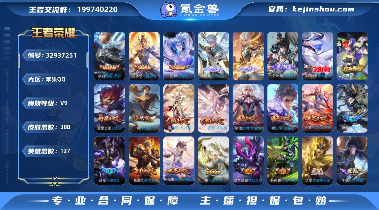 127英雄-388皮肤-苹果QQ/可二次/极品男神号/还差5kv10/耀全皮/孙策全皮/荣耀王者/388皮肤/127英雄/3典藏/0珍品无双/4无双/3珍品传说/43传说/125史诗/8稀有英雄 【3 珍品传说】沧流箭 伽罗,怪盗基德 马可波罗,时之奇旅 孙策, 【3 典藏皮肤】鸣剑·曳影 李白,幻阙歌 貂蝉,九霄神辉 花木兰, 【4 无双皮肤】天机白泽 诸葛亮,无相 孙悟空,离恨烟 公孙离,器灵·螭龙剑 曜, 【43 传说皮肤】启明星使 虞姬,飞鸢探春 李元芳,无双飞将 马超,白虎志 百里玄策,李逍遥 曜,地狱火 孙悟空,云鹰飞将 曜,齐天大圣 孙悟空,永曜之星 杨戬,诗剑行 李白,灼幽烈阳 东皇太一,猫影幻舞 貂蝉,神骥·赴朔漠 狄仁杰,神骥·聚万邦 貂蝉,神骥·逐星野 马超,地狱之眼 宫本武藏,神骥·越千峰 云缨,默契交锋 兰陵王,鹤羽星尊 诸葛亮,炽阳神光 镜,黄金射手座 后羿,无限倾心 项羽,乘龙·问璇玑 孙尚香,时之恋人 刘备,挚爱之约 孙策,黄金狮子座 达摩,久胜战神 干将莫邪,末日机甲 孙尚香,乘龙·淬吴钩 孙策,末日机甲 孙策,山海·炽霜斩 李信,一念神魔 李信,天魔缭乱 吕布,踏浪归 韩信,绛天战甲 铠,山海·苍雷引 曜,霜北刀 夏侯惇,愿照·九州拓 澜,黄金天蝎座 墨子,神树通天 后羿,幻光神枪 云缨,愿照·岁时盈 虞姬,鸣野蒿 桑启,...