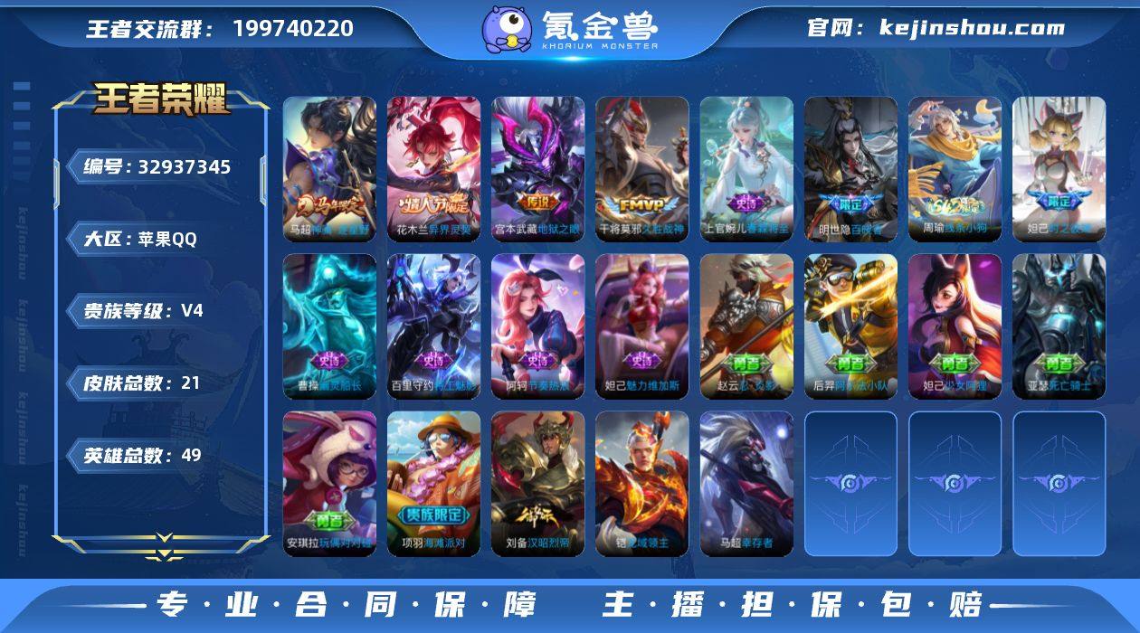 xy17497【秒换绑,无需等三天】V4-21皮肤-1王者印记 苹果Q-V-21皮肤4传说 【传说】 异界灵契花木兰 神骥逐星野 久胜战神 地狱之眼 【热门】百晓客 时之彼端 特工魅影 幽灵船长 节奏热浪 魅力维加斯 49英雄-营地ID:1549163107