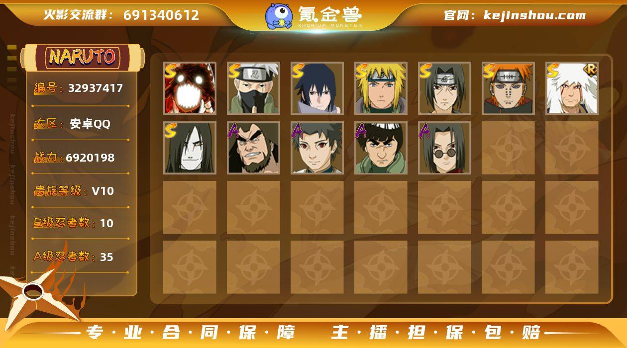 安卓QQ-v10-影级-692w战力成品小号-到手即可畅玩,买到就是赚到-漩涡鸣人「暴怒·第六尾」-宇智波佐助「永恒万花筒」-宇智波佐助「永恒万花筒」-宇智波带土「暴怒」-宇智波鼬「新春限定」-小南「神驹佑将」-我爱罗「新春限定」-S忍者数:10- A忍者数:35 【S级忍者】旗木卡卡西「须佐能乎」(3星),漩涡鸣人「暴怒·第六尾」(3星),宇智波斑「秽土转生·解」(3星),宇智波佐助「永恒万花筒」(3星),自来也「舞之豪杰」(3星),宇智波鼬「须佐能乎」(3星),漩涡鸣人·宇智波佐助(3星),佩恩「天道」(3星),波风水门(3星),大蛇丸(4星), 【A级忍者】宇智波带土「暴怒」(2星),旗木卡卡西「幻之真容」(2星),漩涡鸣人「九尾查克拉」(2星),宇智波鼬「新春限定」(2星),我爱罗「忍界大战」(2星),蝎「绯流琥」(2星),秋道丁次「忍界大战」(2星),宇智波泉奈(2星),神农「羁绊」(2星),宇智波止水(2星),干柿鬼鲛(3星),猿飞阿斯玛(4星),迈特凯(3星),蝎(2星),桃地再不斩(2星),猿飞阿斯玛「秽土转生」(2星),我爱罗「疾风传」(2星),飞段(2星),飞段「死司凭血」(2星),宇智波鼬(2星),艾「青年」(2星),日向雏田「最终章」(2星),我爱罗「新春限定」(2星),角都「秽土转生」(2星),日...