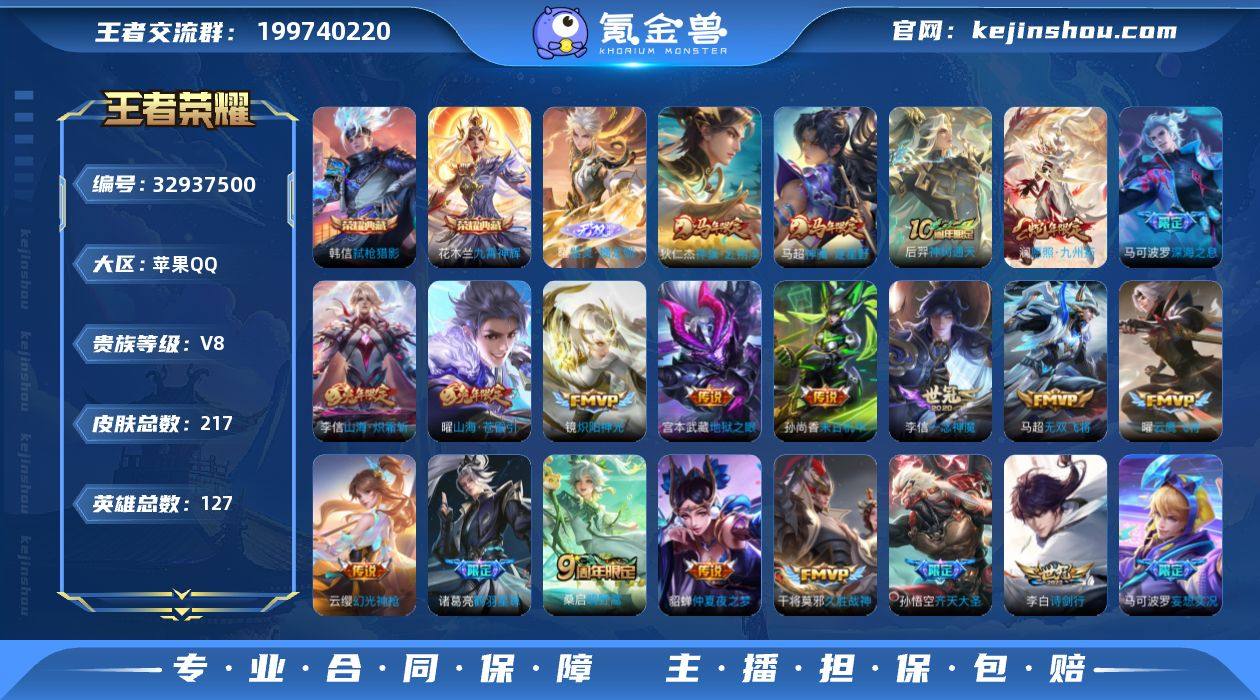 苹果Q-V8-最强王者段位-127英雄-217皮肤-2典藏皮肤-1无双-28传说-65史诗 【英雄全皮】:孙权全皮 【荣耀典藏】:花木兰九霄神辉,韩信弑枪猎影 【无双皮肤】:曜器灵螭龙剑 【传说皮肤】:狄仁杰神骥赴朔漠,马超神骥逐星野,后羿神树通天,澜愿照九州拓,云缨幻光神枪,桑启鸣野蒿,马可波罗妄想实况,诸葛亮鹤羽星尊,花木兰燃星之曲,孙悟空齐天大圣,曜山海苍雷引,李信山海炽霜斩,李白诗剑行,百里守约碎云,马可波罗深海之息,马超无双飞将,铠绛天战甲,镜炽阳神光,虞姬启明星使,曜云鹰飞将,李信一念神魔,张良黄金白羊座,干将莫邪久胜战神,梦奇胖达荣荣,貂蝉仲夏夜之梦,孙尚香末日机甲,宫本武藏地狱之眼,狄仁杰超时空战士 【限定皮肤】:姜子牙天穹之誓,杨戬破阵退雄兵,狄仁杰阴阳师,赵云皇家上将,赵云引擎之心,高渐离玩趣恶龙,扁鹊奇幻香踪,元歌云间偶戏,元歌无心,马可波罗深海之息,马可波罗妄想实况,狄仁杰魔术师,项羽海滩派对,关羽百相守梦,花木兰燃星之曲,孙悟空美猴王,孙悟空至尊宝,孙悟空齐天大圣,后羿圣弓游侠,刘备百相守梦,李元芳云中旅人,虞姬启明星使,杨戬潮玩骑兵,诸葛亮鹤羽星尊,公孙离玉兔公主,沈梦溪匿光破解者,裴...