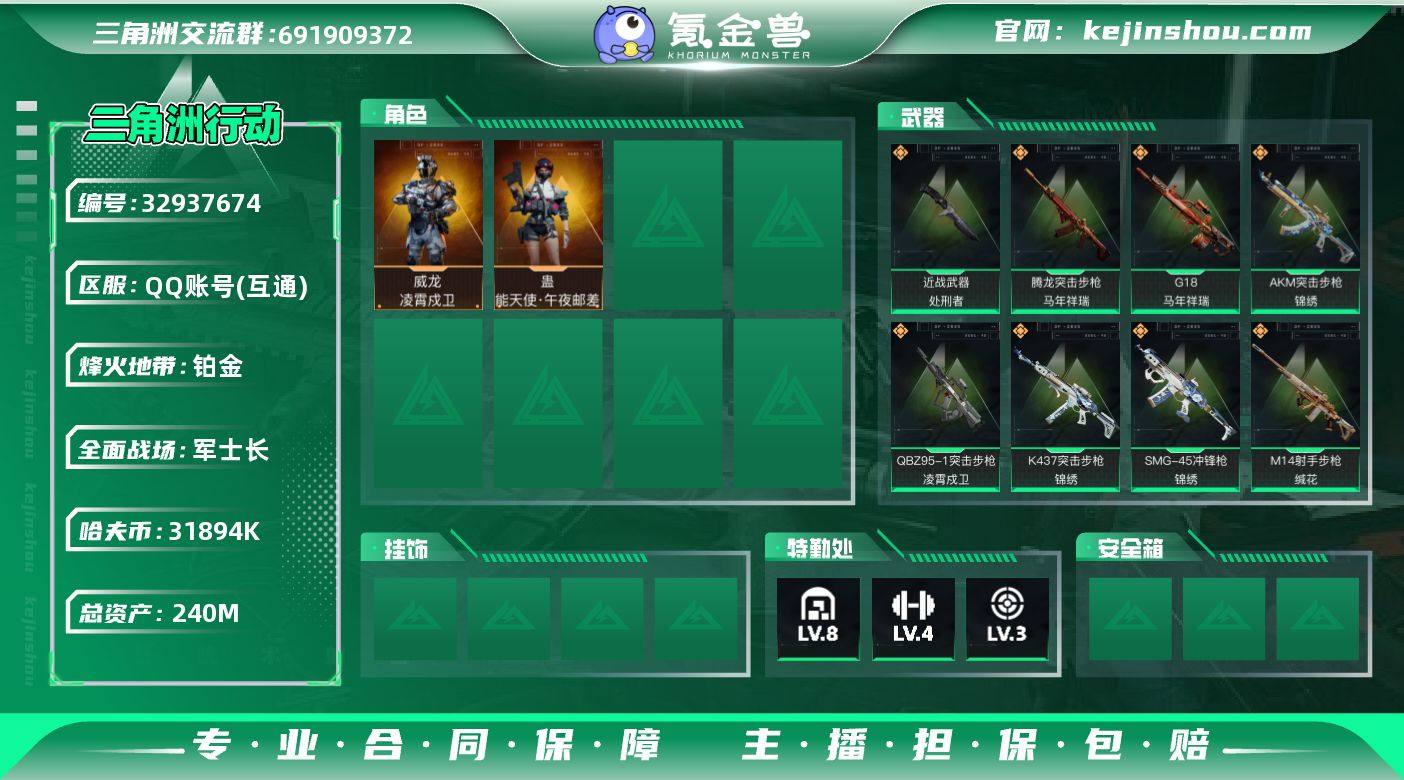 实名: 不可修改 烽火地带段位: 铂金 全面战场段位: 军士长 总资产: 240000000 哈夫币: 31894000 干员外观: 蛊-能天使·午夜邮差,威龙-凌霄戍卫 传说武器皮肤: AK-12突击步枪-特斯拉线圈,SR-3M紧凑突击步枪-特斯拉线圈,UZI冲锋枪-特斯拉线圈,勇士冲锋枪-能天使-午夜邮差,Vector冲锋枪-能天使-午夜邮差,SCAR-H战斗步枪-启航,SKS射手步枪-骑士,近战-处刑者,QBZ95-1突击步枪-凌霄戍卫,腾龙突击步枪-马年祥瑞,G18-马年祥瑞,.357左轮-缄花,SR-25射手步枪-缄花,M14射手步枪-缄花,SMG-45冲锋枪-锦绣,K437突击步枪-锦绣,AKM突击步枪-锦绣 史诗武器皮肤: M700狙击步枪-竞技风,S12K霰弹枪-曙光,AUG突击步枪-蝮蛇,M700狙击步枪-蝮蛇,PKM通用机枪-蝮蛇,MP5冲锋枪-深海恐惧,SV-98狙击步枪-林中猎手,SV-98狙击步枪-囚徒,SCAR-H战斗步枪-囚徒,Vector冲锋枪-猎鳄行动,SR-3M紧凑突击步枪-战术竞备,Vector冲锋枪-异域战争,M700狙击步枪-哈夫克警备,G3战斗步枪-哈夫克警备,MP5冲锋枪-竞技风,K416突击步枪-冬日风情,SMG45冲锋枪-阿萨拉特攻,K416突击步枪-阿萨拉特攻,PKM通用机枪-阿萨拉特攻,MP7冲锋枪-六套之力 载具皮肤: 轮式突击炮-荣耀,M1A4坦克-驯鹿,突击直升机-英雄 亮点: 【sjs10360】包人脸 2...