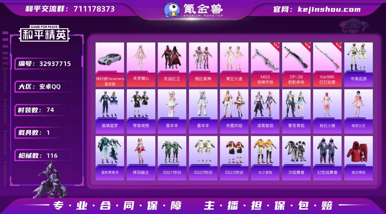 【特价出售/店主推荐】安卓 手Q-5粉装-4特效枪-1载具-3粉色飞行器-37099热力值-2王牌印记-74套装-116枪皮【热门品类】:套装-粉红小猪【粉色套装】:粉装-炙焰红王,粉装-银红美神,粉装-第五大道,角色-羊梦糖心,角色-虎痴许褚【粉色枪皮等级】:Kar98K-巳巳如意(五级),Mk14-福马献瑞(一级),DP-28-豹影疾电(五级),MG3-洛神天依(七级)【粉色载具】:保时捷Panamera(星辰紫)【粉色枪皮】:Kar98K-巳巳如意,Mk14-福马献瑞,DP-28-豹影疾电,MG3-洛神天依【粉色飞行器】:炫彩糖果飞行器,梦幻火箭飞行器,齐天大圣飞行器