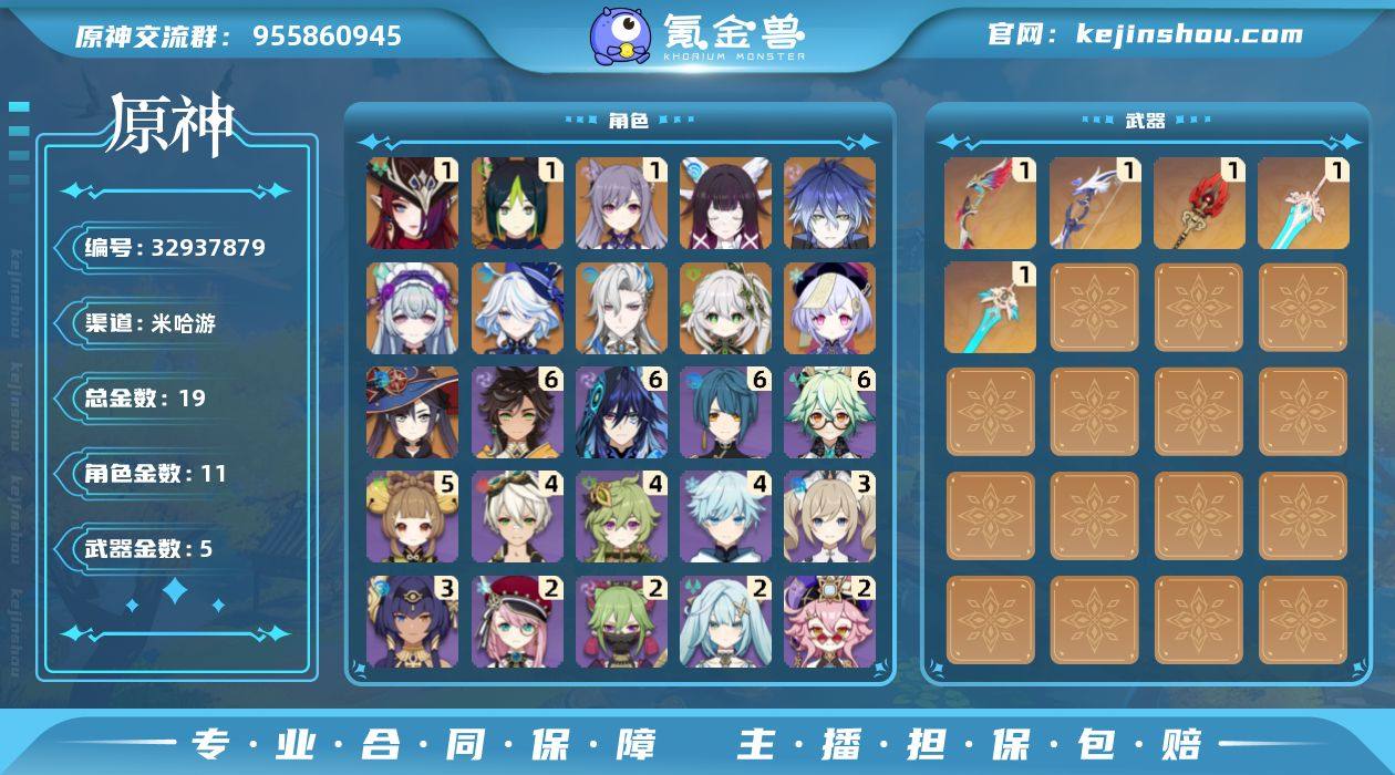 邮箱: 未绑定 总黄数: 19 冒险等级: 56 1命金色角色: 一命刻晴,一命提纳里,一命恰斯卡 0命金色角色: 七七,莫娜,纳西妲,那维莱特,芙宁娜,梦见月瑞希,菲林斯,哥伦比娅 拥有武器: 天空之傲,天空之刃,护摩之杖,若水,星鹫赤羽 1精武器: 天空之傲,天空之刃,护摩之杖,若水,星鹫赤羽
