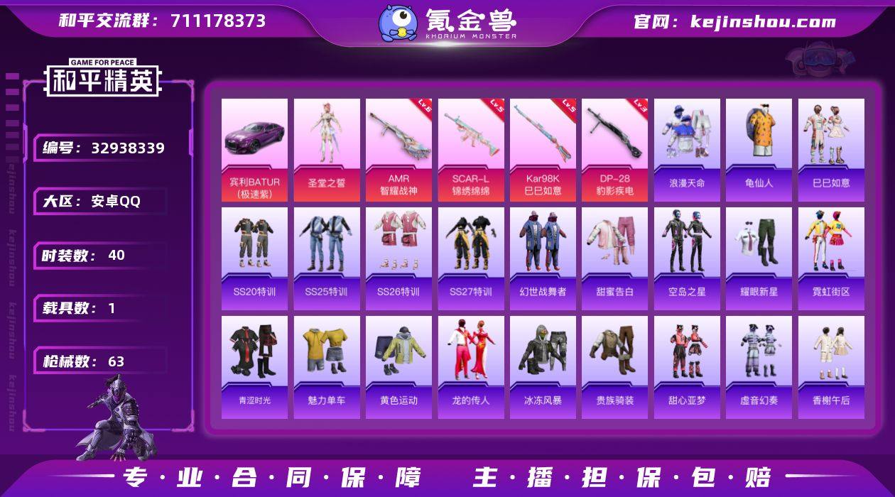安卓 手Q-1粉装-4特效枪-1载具-1粉色飞行器-20097热力值-2王牌印记-40套装-63枪皮【热门品类】:套装-浪漫天命,套装-龟仙人【粉色套装】:角色-圣堂之誓【粉色枪皮等级】:SCAR-L-锦绣绵绵(五级),Kar98K-巳巳如意(五级),AMR-智耀战神(六级),DP-28-豹影疾电(三级)【粉色载具】:宾利BATUR(极速紫)【粉色枪皮】:SCAR-L-锦绣绵绵,Kar98K-巳巳如意,AMR-智耀战神,DP-28-豹影疾电【粉色飞行器】:夜幕颂歌飞行器【粉色降落伞】:至尊龙雀降落伞,恐龙拽拽降落伞,精灵梦叶罗丽降落伞【稀有套装】:套装-龟仙人,套装-巳巳如意【稀有枪皮】:AKM-霓虹街区,AKM-龙的传人,M16A4-幻世战舞者,M16A4-甜心亚梦,SCAR-L-炫彩节奏,M416-糯团青竹,M416-蓝色火焰,GROZA-影袭,QBZ-彩虹符号,M762-奇异狩猎者,AC-VAL-快闪甜心,AC-VAL-甜心亚梦,UZI-啾咪啾咪,UZI-红色方程式,UMP45-蓝色火焰,Vector-焰鹰斗篷,P90-快闪甜心,Kar98K-彩虹符号,AWM-焰鹰斗篷,AWM-胡桃卫兵,SKS-炫彩节奏,SKS-青丘仙客,MK20-H-快闪甜心,MK20-H-莲影清波,S686-奇异狩猎者,DBS-焰鹰斗篷,DBS-圣堂之誓,DBS-甜心亚梦,DBS-第五大道,M249-彩虹符号,M249-糯团青竹,M249-莲影清波,DP-28-...