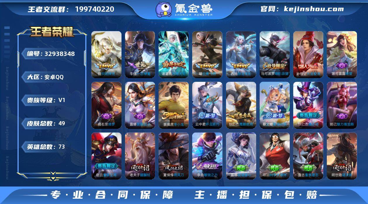 安卓Q-V0-荣耀黄金II段位-73英雄-49皮肤-5传说-12史诗【传说皮肤】:西施游龙清影,诸葛亮时雨天司,镜炽阳神光,曜云鹰飞将,李信一念神魔【限定皮肤】:狄仁杰阴阳师,赵云皇家上将,夏侯惇朔风刀,马可波罗暗影游猎,狄仁杰魔术师,狄仁杰万华元夜,项羽海滩派对,老夫子醍醐杖,程咬金演武夺筹,孙悟空大圣娶亲,钟馗驱傩正仪,蔡文姬繁星吟游,鬼谷子原初探秘者,诸葛亮时雨天司,明世隐疑决卦,裴擒虎李小龙,云中君纤云弄巧,猪八戒西部大镖客【年限皮肤】:诸葛亮时雨天司【赛季限定】:夏侯惇朔风刀,明世隐疑决卦,老夫子醍醐杖,鬼谷子原初探秘者,狄仁杰万华元夜,程咬金演武夺筹,钟馗驱傩正仪【战令限定】:马可波罗暗影游猎,猪八戒西部大镖客【史诗皮肤】:云中君纤云弄巧,裴擒虎李小龙,马可波罗暗影游猎,橘右京修罗,娜可露露晚萤,蔡文姬繁星吟游,狄仁杰鹰眼统帅,孙悟空大圣娶亲,妲己魅力维加斯,狄仁杰魔术师,赵云皇家上将,露娜紫霞仙子【其他皮肤】:鲁班大师乓乓大师,钟馗驱傩正仪,盘古重装意志,程咬金演武夺筹,露娜瓷语鉴心,狄仁杰万华元夜,鬼谷子原初探秘者,廉颇无尽征程,猪八戒西部大镖客,老夫子醍醐杖,明世隐疑决卦,鲁班七号黑桃...