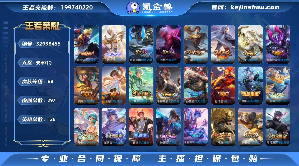 安卓Q-V8-最强王者段位-126英雄-297皮肤-1典藏皮肤-1无双-12传说-76史诗【英雄全皮】:敖隐全皮【荣耀典藏】:孙悟空全息碎影【无双皮肤】:孙悟空无相【传说皮肤】:朵莉亚神骥鸣幻洲,云缨幻光神枪,桑启鸣野蒿,典韦战鼓燎原,孙悟空齐天大圣,曜李逍遥 ,镜炽阳神光,虞姬启明星使,干将莫邪久胜战神,李白凤求凰,宫本武藏地狱之眼,孙悟空地狱火【限定皮肤】:狄仁杰阴阳师,小乔纯白花嫁,赵云皇家上将,孙尚香蔷薇恋人,高渐离玩趣恶龙,阿轲迷踪丽影,钟无艳王者之锤,芈月幻夜卜梦,吕布御风骁将,元歌云间偶戏,夏侯惇朔风刀,甄姬游园惊梦,马可波罗暗影游猎,狄仁杰魔术师,狄仁杰万华元夜,达摩星际陆战队,达摩沙漠行僧,项羽海滩派对,老夫子醍醐杖,程咬金演武夺筹,刘邦夺宝奇兵,韩信飞衡,兰陵王金庭之子,亚瑟潮玩骑士王,孙悟空至尊宝,孙悟空大圣娶亲,孙悟空孙行者,孙悟空齐天大圣,牛魔御旌,后羿圣弓游侠,李元芳银河之约,李元芳云中旅人,虞姬霸王别姬,虞姬启明星使,钟馗驱傩正仪,杨玉环寅虎心曲,干将莫邪冰霜恋舞曲,干将莫邪真爱魔法,雅典娜单词大作战,雅典娜黎明之约,鬼谷子原初探秘者,鬼谷子五谷丰年,黄忠火炮绅士,铠青龙志,苏烈...