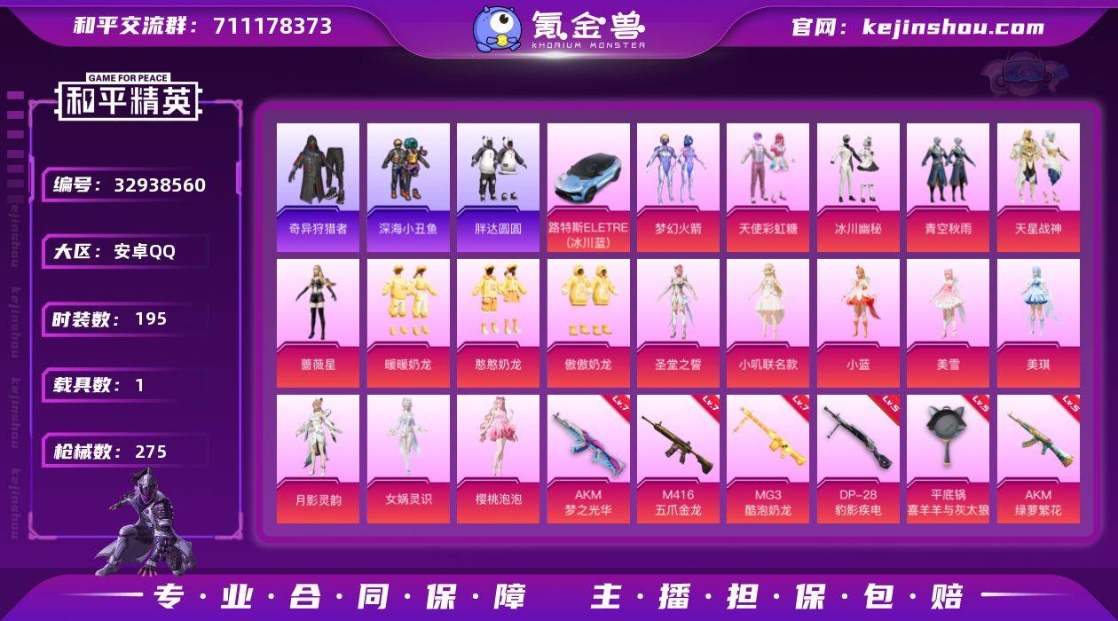 安卓 手Q-17粉装-10特效枪-1载具-2粉色飞行器-91149热力值-19王牌印记-195套装-275枪皮【热门品类】:粉装-梦幻火箭,套装-浪漫天命,套装-深海小丑鱼,套装-奇异狩猎者,套装-胖达圆圆,套装-龟仙人,套装-暗影哥特【粉色套装】:粉装-天使彩虹糖,粉装-梦幻火箭,粉装-冰川幽秘,粉装-青空秋雨,粉装-天星战神,角色-蔷薇星,粉装-暖暖奶龙,粉装-憨憨奶龙,粉装-傲傲奶龙,角色-圣堂之誓,角色-小叽联名款,角色-小蓝,角色-美雪,角色-美琪,角色-月影灵韵,角色-女娲灵识,角色-樱桃泡泡【粉色枪皮等级】:AKM-梦之光华(七级),AKM-绿萝繁花(五级),SCAR-L-锦绣绵绵(五级),M416-五爪金龙(七级),AUG-暖羊咩咩(五级),Kar98K-巳巳如意(五级),Mk14-福马献瑞(四级),DP-28-豹影疾电(五级),MG3-酷泡奶龙(七级),平底锅-喜羊羊与灰太狼(六级)【粉色载具】:路特斯ELETRE(冰川蓝)【粉色枪皮】:AKM-梦之光华,AKM-绿萝繁花,SCAR-L-锦绣绵绵,M416-五爪金龙,AUG-暖羊咩咩,Kar98K-巳巳如意,Mk14-福马献瑞,DP-28-豹影疾电,MG3-酷泡奶龙,平底锅-喜羊羊与灰太狼【粉色飞行器】:炫彩糖果飞行器,齐天大圣飞行器【粉色降落伞】:海渊国主降落伞,暗星紫秘降落伞,环太平...