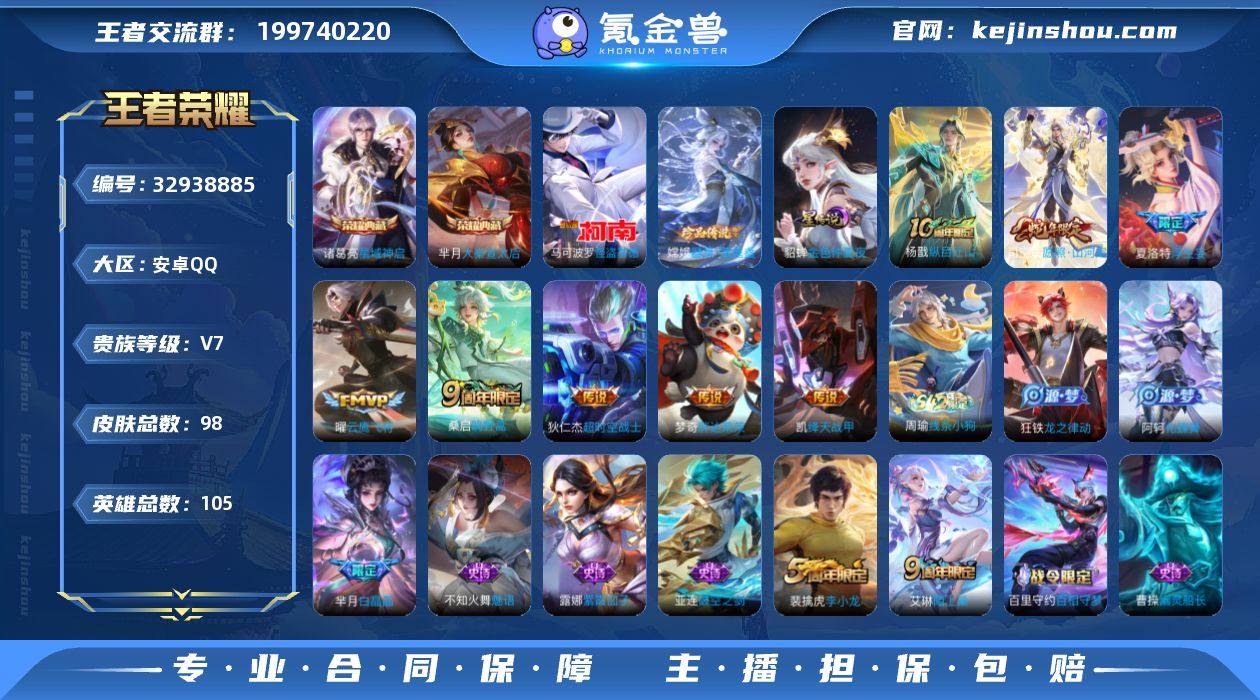 实名: 可修改 贵族等级: V7 英雄数: 105 皮肤数: 98 荣耀水晶: 大秦宣太后,星域神启 珍品传说: 怪盗基德,器灵·落星盏 星传说: 金色仲夏夜 传说皮: 云鹰飞将,绛天战甲,胖达荣荣,超时空战士-狄仁杰,浮生妄,纵目迁山 限定皮: 李小龙,白晶晶,鸣野蒿,陌上桑,逐霄战戟,愿照·山河定 亮点: 安卓Q-V7-至尊星耀II段位-105英雄-98皮肤-2典藏皮肤-2珍品传说-9传说-32史诗【英雄全皮】:孙权全皮【荣耀典藏】:芈月大秦宣太后,诸葛亮星域神启【珍品传说】:嫦娥器灵落星盏,马可波罗怪盗基德【传说皮肤】:马超神骥逐星野,杨戬纵目迁山,司空震愿照山河定,桑启鸣野蒿,夏洛特浮生妄,铠绛天战甲,曜云鹰飞将,梦奇胖达荣荣,狄仁杰超时空战士【限定皮肤】:狄仁杰阴阳师,赵云皇家上将,嬴政优雅恋人,芈月白晶晶,狄仁杰魔术师,项羽海滩派对,裴擒虎李小龙,夏洛特浮生妄【年限皮肤】:司空震愿照山河定【赛季限定】:东皇太一噬灭天穹,太乙真人谧流熔炉,钟馗虚灵犬护,甄姬逆浪荇歌【战令限定】:亚连破空之剑,廉颇撼地雄心,孙悟空神迹守卫,百里守约百相守梦,老夫子百相守梦,孙膑茶境仙,马超访茗客,周瑜线条小狗【史诗皮肤】:周瑜线条小狗,狂铁龙之律动,阿轲化蝶舞,芈月...