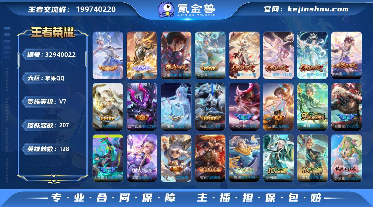 实名: 可修改 性别: 男号 贵族等级: V7 英雄数: 128 皮肤数: 207 荣耀水晶: 最初的交响 无双皮: 器灵·螭龙剑 传说皮: 炽阳神光,地狱之眼,飞鸢探春,无双飞将,妄想奇谈,霜月吟,乘龙·问璇玑,幻光神枪,云诺千山,神骥·越千峰 限定皮: 李小龙,绯月行,山海·玄木吟,齐天大圣,无限倾心-虞姬,鸣野蒿,愿照·众生和,愿照·岁时盈,愿照·九州拓 亮点: 【优质装备】:器灵·螭龙剑,最初的交响(伽罗典藏),炽阳神光,地狱之眼,飞鸢探春,无双飞将,妄想奇谈,霜月吟,涂山容容