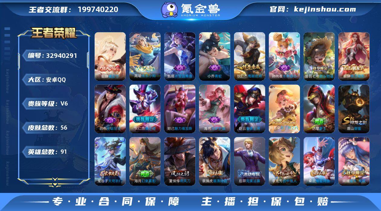 实名: 可修改 性别: 男号 贵族等级: V6 英雄数: 91 皮肤数: 56 传说皮: 貂蝉曦玄引