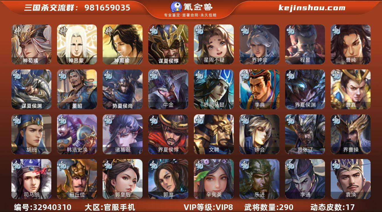 【4479】官阶:骠骑将军;VIP等级:VIP8;史诗武将数量:18;动态皮肤数量:17;武将总数:290;史诗宝珠数量:0;将魂数量:1342;神将:1;魏国史诗武将:8;蜀国史诗武将:5;吴国史诗武将:2;群史诗武将:5