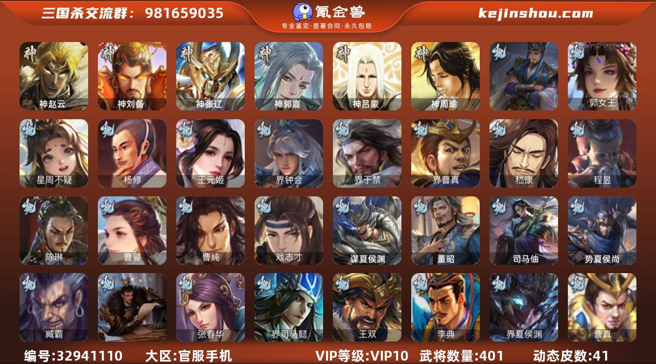 【4663】官阶:大将军;VIP等级:VIP10;史诗武将数量:49;动态皮肤数量:41;武将总数:401;史诗宝珠数量:0;将魂数量:4991;神将:4;魏国史诗武将:21;蜀国史诗武将:11;吴国史诗武将:8;群史诗武将:12 神赵云,神刘备,神张辽,神郭嘉,郭女王,星周不疑,杨修,王元姬,界钟会,界于禁,界曹真,嵇康,陈琳,曹婴,曹纯,戏志才,蒋济,程昱,谋诸葛亮,马云騄,谋夏侯氏,谋马超,诸葛瞻,赵襄,沙摩柯,谯周,界黄忠,花鬘,谋关羽,周处,孙寒华,骆统,留赞,界朱然,界徐盛,界步练师,贺齐,左慈,星甘宁,苏飞,司马徽,麹义,刘焉,沮授,界李儒,杜预,谋张角,许攸,兀突骨,神吕蒙,神周瑜,势夏侯尚,SP关羽,SP曹仁,SP蔡文姬,乐进,曹昂,诸葛诞,朱灵,文聘,SP姜维,张春华,钟会,曹冲,郭淮,满宠,界王异,界曹操,界司马懿,界夏侯惇,界张辽,界许褚,李典,曹真,韩浩史涣,陈群,曹叡,曹休,钟繇,司马朗,王基,李通,郭皇后,辛宪英,吕虔,鲁芝,蒯越蒯良,界典韦,界荀彧,界徐晃,杜畿,界曹丕,界邓艾,张恭,贾逵,界曹植,界满宠,界郭淮,卞夫人,华歆,蔡贞姬,袁涣,王双,崔琰,杨阜,阮慧,曹嵩,谋徐晃,谋于禁,界曹休,牵招,胡班,司马伷,文钦,谋夏侯渊,界夏侯渊,臧霸,唐咨,董昭,势陈到,SP孙尚香,关银屏,夏侯霸,马良,关兴张苞,廖化,界马岱,关平,简雍,...