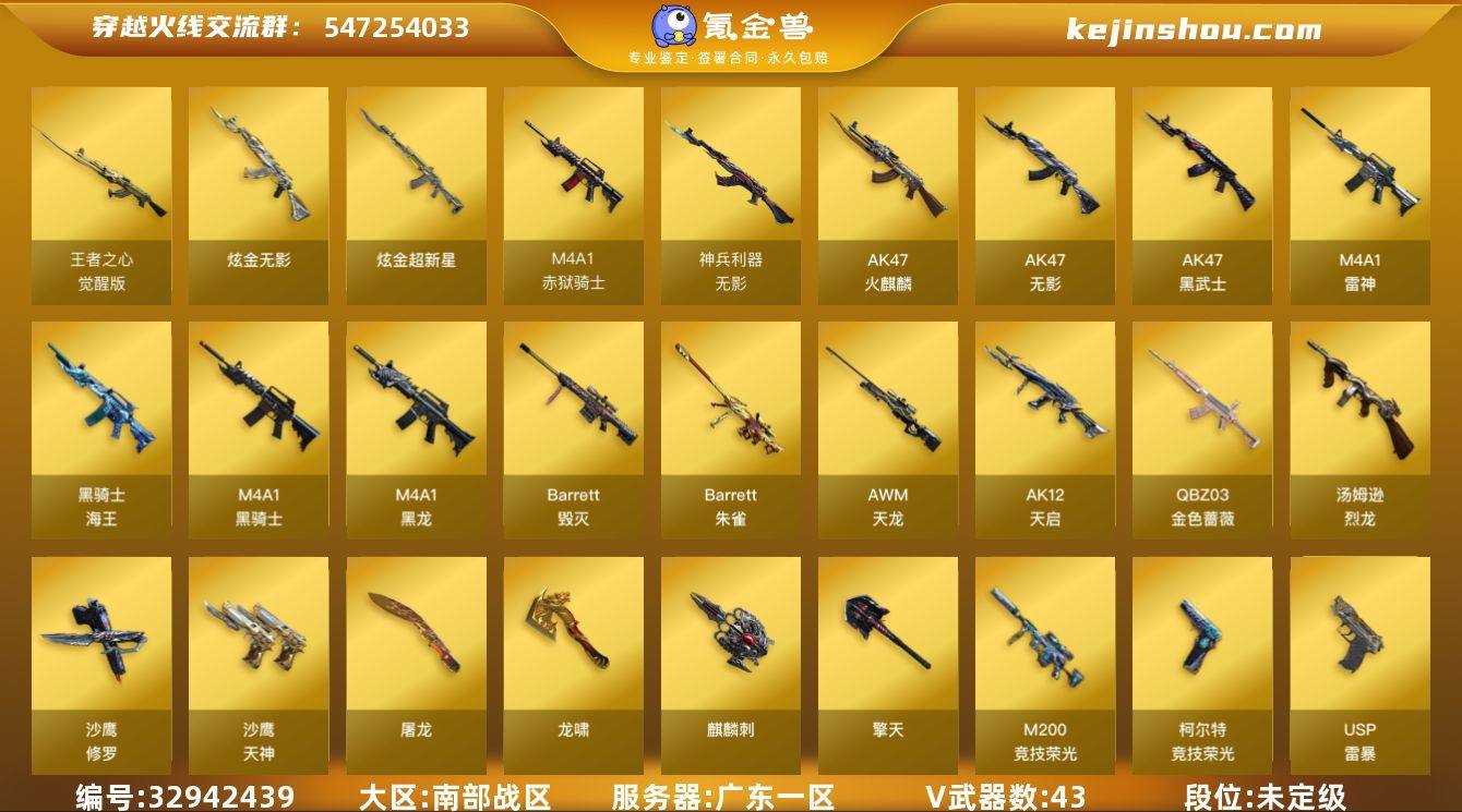 广东一区-51V-3王者武器数-2炫金武器数 【热门武器】:QBZ03-金色蔷薇,M200-竞技荣光,M4A1-黑骑士,汤姆逊-烈龙*2,加特林-炼狱,降世魔童,USP-雷暴,沙鹰-修罗 【王者炫金武器】:炫金无影,炫金超新星 【音效卡】:M4A1-黑骑士音效卡 【皮肤】:火麒麟-平天大圣,火麒麟-心动糖果,毁灭-冠军之怒,毁灭-黑曼巴 皮肤,黑龙-能量核心,黑骑士耀金皮肤,天龙-能量核心,修罗-能量核心*2,天神-暗月 【角色】:电竞教官-云悠悠,审判者,零·纪元,太空指挥官,奇洋探员,乔伊教练,修道士,云海玲珑,幻面灵狐,斗烈龙骑,初恋灵狐,风暴女,嘉年华灵狐,灵狐者-黄金海岸,灵狐者-七夕宝贝,龙儿,麻雀,潘多拉-甜心教官,斯沃特-X,蜀雪,兔囡囡,雪莉杨,雪莉杨-摸金校尉,团团 【人偶武器】:加特林-机械猎手,AWM-灵狐-15周年嘉年华*2,迷你牛魔王,迷你牛牛,降世魔童 【暴走生化】:超级对讲机 【挑战大师】:冰龙粉碎者-白马银枪,激光毁灭者III-白马银枪*2,试炼破坏者III,神圣爆裂者-末日III 【英雄级武器】:AK47-火麒麟*2,M4A1-黑龙,M4A1-雷神,M4A1-黑骑士,AK47-无影,AK47-黑武士,AK12-天启,无影-神兵利器,QBZ03-独角-III,QBZ03-金色蔷薇,王者之心-觉...