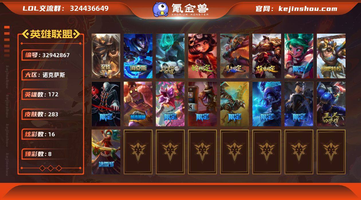 t38686 皇冠账号【诺克萨斯】 283皮肤 16炫彩 8臻彩 5神话/38限定/23传说/172英雄 账号等级:490 单双排段位:青铜 【重要皮肤】机神玄武盖伦至臻 海克斯科技嘉文四世 胜利剑圣易 安妮梦游仙境 电玩女神厄运小姐 电玩勇者锐雯 电玩女神阿狸 黎明使者薇恩 点心宝贝阿木木 替父从军花木兰 古琴余韵娑娜 你看见过我的熊猫吗安妮 张辽文远 胜利女神莫甘娜 平安夜女神娑娜 魅惑女巫奈德丽 SSW锤石 SSW雷恩加尔 冰雪节辛吉德 防暴士兵辛吉德 防暴天使凯尔 钢铁之翼艾尼维亚 冠军典狱长锤石 冠军之血希瓦娜 春晖山神墨菲特 鬼影森森茂凯 胡桃夹子萨科 惊悚派对费德提克 蒙多蒙多 圣诞狂欢努努和威朗普 圣诞老人古拉加斯 圣诞玩偶波比 幸福女神乐芙兰 野兽猎人泰达米尔 英勇玩具兵普朗克 诺斯费拉图弗拉基米尔 阿木木主人不要我了 波比的巧克力工坊 十周年纪念安妮 源代码乐芙兰 神凰行者瑞羽圣凰艾尼维亚 暗裔英雄盖伦 【传说皮肤】源计划联合艾希 铁哥们儿奥拉夫 恶魔男爵瑞兹 冰霜之刃艾瑞莉娅 宇航员诺提勒斯 金牌主播德莱文 最终BOSS维迦 灌篮高手德莱厄斯 烈焰雄心崔丝塔娜 黯黑魔龙希瓦娜 丧尸布兰德 绅士科加斯 女皇艾...