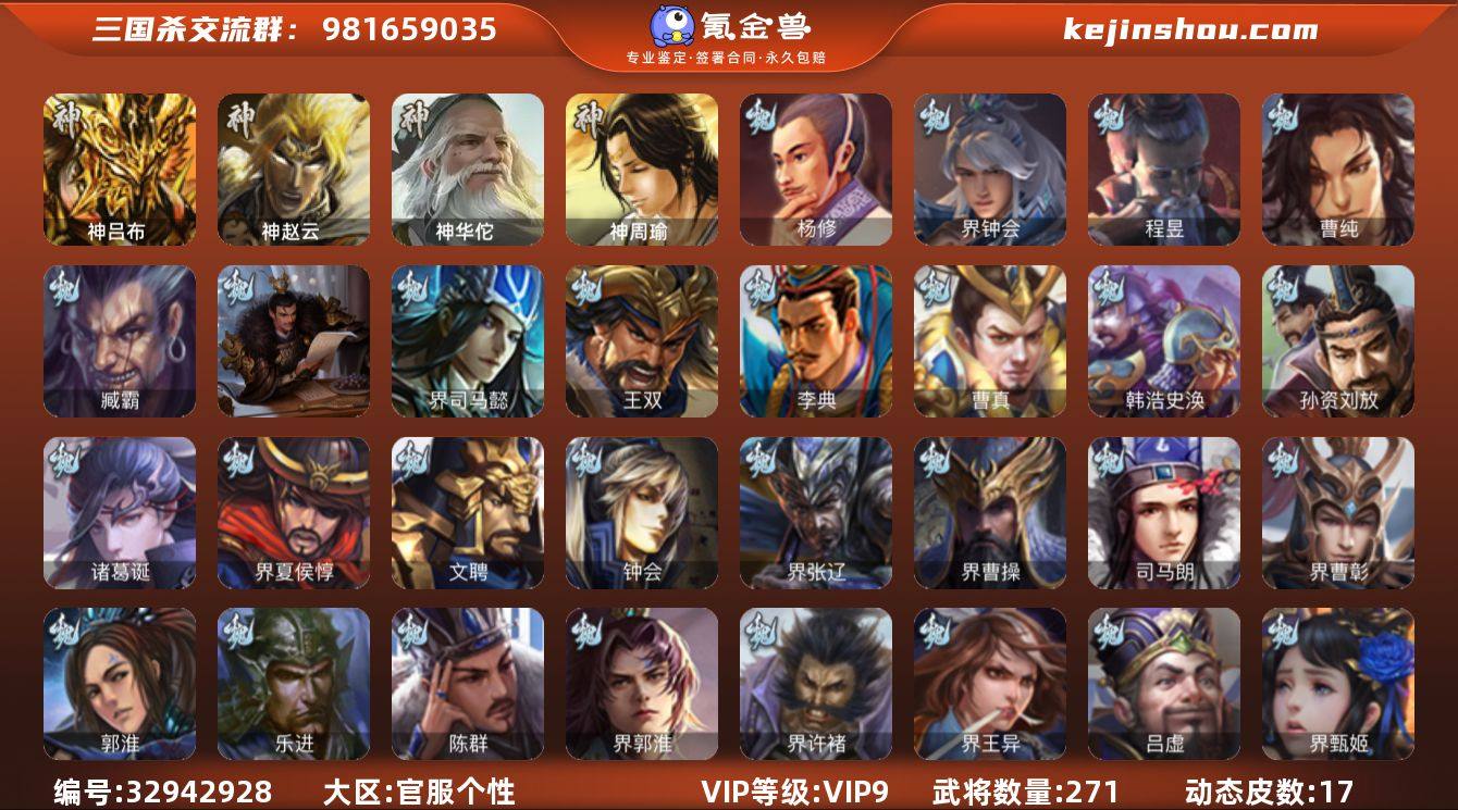 【3640】官阶:骠骑将军;VIP等级:VIP9;史诗武将数量:19;动态皮肤数量:17;武将总数:271;史诗宝珠数量:28;将魂数量:11;神将:3;魏国史诗武将:8;蜀国史诗武将:5;吴国史诗武将:2;群史诗武将:5