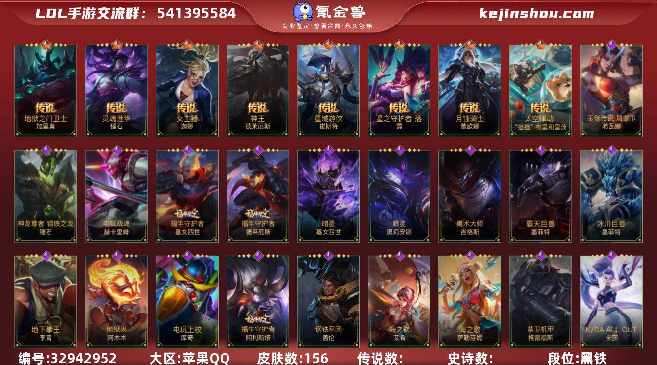 136英雄-156皮肤 【神话皮肤】:夜星流火 金克丝,芳醇蜜韵 悠米,流光仙韵 莫甘娜 【传说皮肤】:星域游侠 崔斯特,太空律动 “猫猫”布里和里茨 布里茨,月蚀骑士 蕾欧娜,星之守护者 落 霞,神王 德莱厄斯,女主播 迦娜,地狱之门卫士 加里奥,灵魂莲华 锤石 【史诗皮肤】:钢铁军团 盖伦,地狱火 阿木木,摄魂猎手 凯隐,黎明使者 卡尔玛,暗星 奥莉安娜,泳池派对 奥莉安娜,清剿小队 金克丝,电玩战魂 赫卡里姆,蕊雪盈春:晏安 赫卡里姆,猛虎 布隆,圣诞老人 布隆,礼物选好了吗? 布隆,K/DA ALL OUT 卡莎,铁血女忍 阿卡丽,泳池派对 菲奥娜,海之歌 萨勒芬妮,源计划:阴 劫,源计划:山 蕾欧娜,我,羽饰骑士 崔丝塔娜,小蜜蜂 提莫,驯龙女巫 璐璐,太空律动 “节奏幻师” 璐璐,玉剑传说 舞龙卫 希瓦娜,太空律动 “百万调音” 格温,暗星 嘉文四世,福牛守护者 嘉文四世,地下拳王 李青,电玩上校 库奇,魅惑女巫 厄运小姐,玉剑传说 无极 易,福牛守护者 德莱厄斯,禁卫机甲 格雷福斯,玉剑传说 风仙子 迦娜,灵魂收割者 德莱文,神龙尊者 苍龙 艾希,海之歌 艾希,福牛守护者 阿利斯塔,霸天巨兽 墨菲特,冰川巨兽 墨菲特,暗星 墨菲特,绒毛 菲兹,奥术大师 吉格...