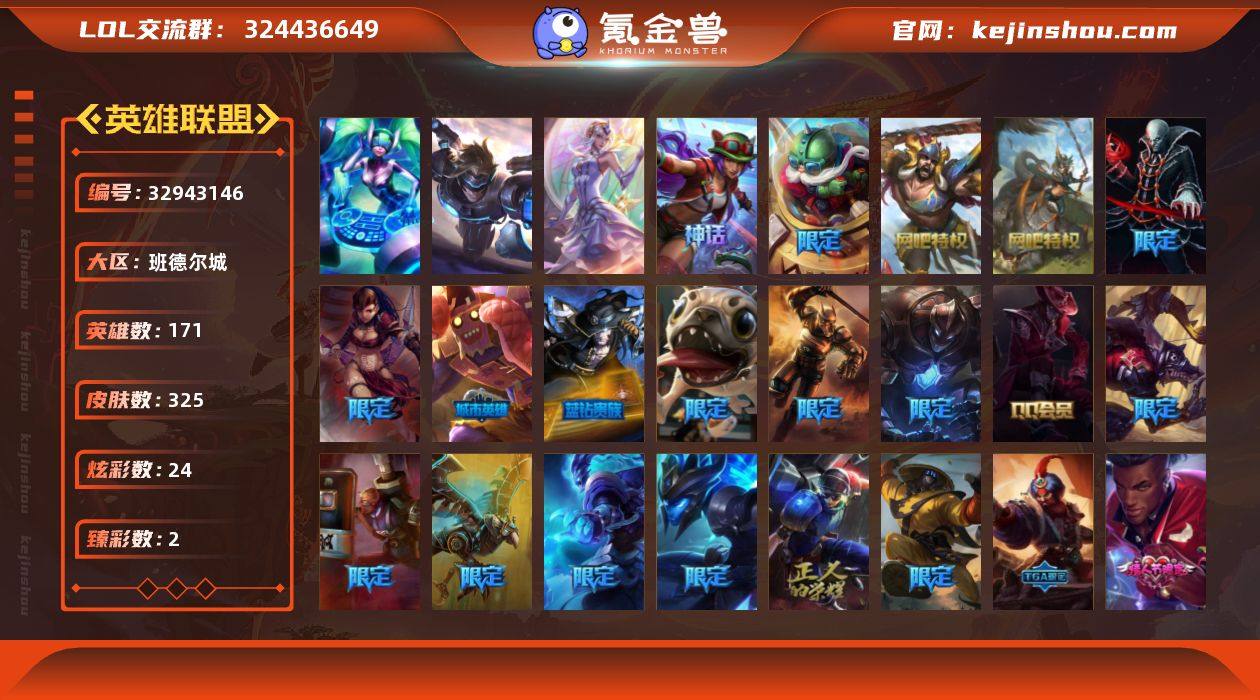 t38833【班德尔城】325皮肤 24炫彩 2臻彩 2神话/68限定/28传说/171英雄 账号等级:336【重要头像】心型钥匙 觅心之翼奎因 击拳 【重要皮肤】胜利剑圣易 胜利巨口克格莫 奥斯曼大帝普朗克 生化领主泰达米尔 荣誉使者玛尔扎哈 古琴余韵娑娜 醒狮克格莫 胜利女神瑟庄妮 胜利机器人布里茨 胜利枪神格雷福斯 胜利枪神卢锡安 胜利之剑亚托克斯 觅心游侠卢锡安 圣诞老人布隆 冬季仙境卡尔玛 魄罗骑士瑟庄妮 圣诞糖果棒厄运小姐 泳池派对厄运小姐 泳池派对塔里克 泳池派对菲奥娜 泳池派对格雷福斯 泳池派对李青 泳池派对蕾欧娜 创战纪希维尔 克格汪 SKTT1奥拉夫 SKTT1阿利斯塔 SSW泰隆 SSW图奇 SSW辛吉德 SKTT1贾克斯 SKTT1薇恩 暗杀星蒙多 暗杀星努努和威朗普 暗杀星伊泽瑞尔 暗杀星慎 Fnatic迦娜 Fnatic库奇 Fnatic古拉加斯 Fnatic嘉文四世 冰雪节辛吉德 防暴士兵辛吉德 防暴天使凯尔 钢铁之翼艾尼维亚 冠军典狱长锤石 冠军之矛卡莉丝塔 海贼瑞兹 红桃杰克崔斯特 警用试作体K9内瑟斯 蓝色忧郁崔斯特 蒙多蒙多 南瓜头费德提克 女猎手希维尔 圣诞精灵崔丝塔娜 圣诞狂欢努努和威朗普 圣诞老人古拉加斯 圣诞玩偶波比 圣诞...