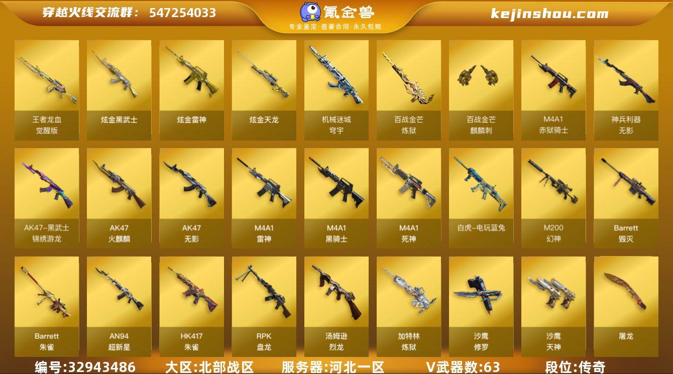 【946723】河北一区-70V-1王者武器数-3炫金武器数 【热门武器】:M14EBR-玄武,HK417-朱雀,M200-幻神,死亡之眼,白虎-电玩蓝兔,炼狱-迷你小钢,M4A1-黑骑士*4,汤姆逊-烈龙*6,RPK-盘龙*2,加特林-炼狱*4,斯泰尔-蝴蝶,USP-钞能力灵狐,沙鹰-修罗 【王者炫金武器】:炫金雷神,炫金武士,炫金天龙 【音效卡】:屠龙-电竞之星-竞星跃动音效卡,AK47-火麒麟音效卡,M4A1-黑骑士音效卡,Barrett-毁灭音效卡,HK417-朱雀-电竞之星-竞星跃动音效卡,Barrett-碧霄极光音效卡*2,麒麟刺-百战金芒-盛典舞曲音效卡,炼狱-百战金芒-庆典舞曲音效卡,柯尔特-百战金芒-庆典舞曲音效卡 【皮肤】:汤姆逊-烈龙-末日皮肤,雷神-暗月,雷神-机甲刑天皮肤,雷神-宇航兔皮肤,M4A1-再燃火线,火麒麟-雷神,火麒麟-轻羽皮肤,火麒麟-心动糖果,毁灭-暗月,毁灭-风暴,毁灭-英雄计划 皮肤,毁灭-斗烈龙驹 皮肤,黑龙-能量核心,黑骑士-暗月,战神-粉色甜心皮肤*5,战神-紫绶金章皮肤,战神-流金岁月皮肤*2,炼狱-玩具枪皮肤,修罗-能量核心,屠龙-春桃 皮肤,轻型军用手斧-再燃火线 【角色】:樱,月兔特工,零·纪元,太空指挥官,乔伊教练,云海玲珑,葵-阿尔法武装,幻面灵狐,斗烈龙骑,初...