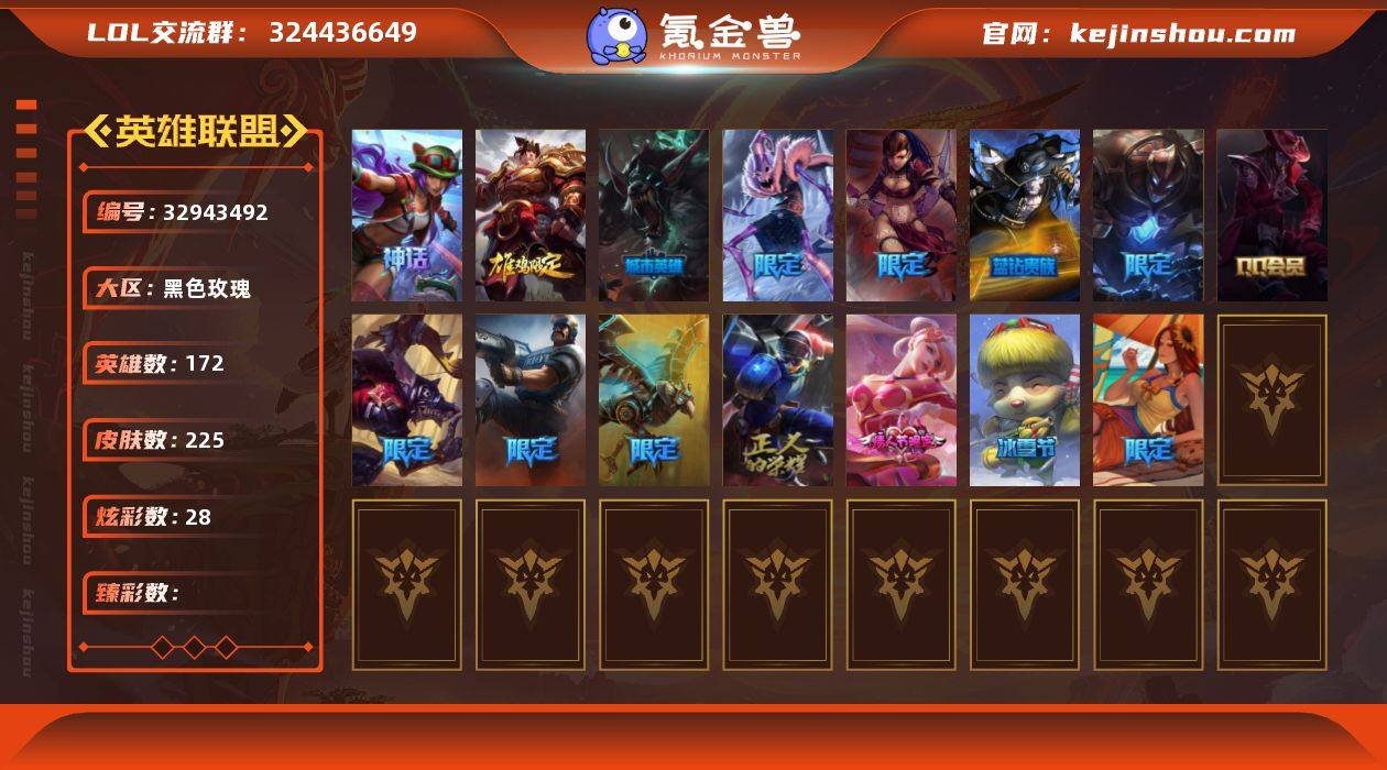 t38886 皇冠号【黑色玫瑰】225皮肤 28炫彩 2神话/42限定/16传说/172英雄 账号等级:663【重要皮肤】胜利行刑官德莱文 胜利剑圣易 胜利女神娑娜 胜利之王泰达米尔 胜利巨口克格莫 荣誉使者玛尔扎哈 天龙之子斯莫德 张辽文远 胜利女神瑟庄妮 胜利之树茂凯 胜利女神奥莉安娜 胜利枪神格雷福斯 胜利枪神卢锡安 胜利之剑亚托克斯 甜心宝贝娑娜 雪球也能爆炸吉格斯 圣诞糖果棒厄运小姐 泳池派对蕾欧娜 SSW图奇 SKTT1李青 SKTT1薇恩 暗杀星蒙多 暗杀星伊泽瑞尔 防暴士兵格雷福斯 防暴天使凯尔 钢铁之翼艾尼维亚 鬼影森森茂凯 红桃杰克崔斯特 胡桃夹子萨科 蓝色忧郁崔斯特 女猎手希维尔 圣诞精灵崔丝塔娜 圣诞开心鬼提莫 圣诞老人古拉加斯 糖果使徒费德提克 喜庆之树茂凯 邪恶圣诞老人维迦 雪默丁格 暗影沃里克 机械迷城加里奥 阿木木主人不要我了 都铎王朝图奇 十五周年纪念希维尔 十周年纪念安妮 胜利凤凰艾尼维亚 【传说皮肤】提莫约德尔人的一大步 屠龙勇士潘森 女校长菲奥娜 神王德莱厄斯 太空律动猫猫布里和里茨 黑夜使者亚索 偶像歌手阿狸 星之守护者拉克丝 炼狱魔犬内瑟斯 女警狙击凯特琳 双重冰晶艾尼维亚 恶魔之刃...