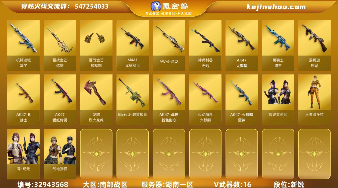 湖南一区-18V-0王者武器数-0炫金武器数 【传说角色】:传说艾莉莎 【热门武器】:炼狱-迷你小钢,汤姆逊-烈龙*3 【音效卡】:炼狱-百战金芒-庆典舞曲音效卡 【皮肤】:M4A1-再燃火线,火麒麟-雷神,火麒麟-心动糖果,战神-粉色甜心皮肤,修罗-百战金芒 皮肤,轻型军用手斧-再燃火线 【角色】:零·纪元,战地猎狐,王者潘多拉,奇洋探员,乔伊教练,云海玲珑,葵-阿尔法武装,暗夜-X,北极狐-X,初恋灵狐,芳心审判者,风暴女,虎妞,嘉年华灵狐,娟娟,灵狐者-X,麻雀,曼陀罗-X,萌儿,潘多拉-X,潘多拉-甜心教官,青霞仙子,斯沃特-X,蜀雪,铁骑荣耀,兔囡囡,影武者-X,智影,潘多拉-N 【人偶武器】:炼狱-迷你小钢,迷你钢铁终结者,跳跳鲨,AWM-灵狐-15周年嘉年华*2,迷你裂空之翼*5,迷你波特博士*5,夺魂*2,迷你牛牛,迷你火种*2,迷你生化手雷,生化手雷-机甲核心*2,深渊终结者手雷,闪光弹-小乔,迷你巨石泰坦-魔花研究所,灵狐娃娃手雷 【暴走生化】:黑龙吞噬者,超级对讲机 【挑战大师】:神圣爆裂者III,激光毁灭者III-白马银枪,VEPR-12-金魔*2,机甲撕裂者III,试炼破坏者III,KAC-圣炎切割者III,神圣爆裂者-末日III,阐释者III*3,封神放逐者III 【英雄级...