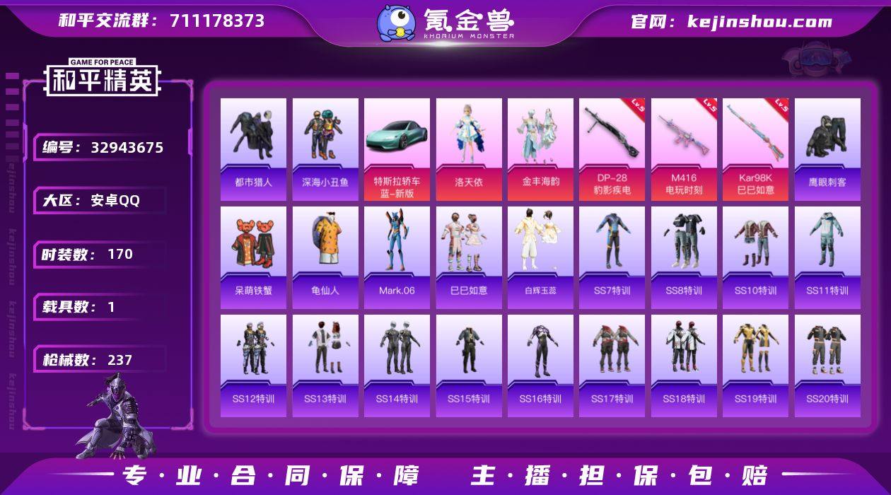 安卓【小号 套装-都市猎人/蓝螳螂/角色-洛天依/M416-电玩时刻(五级)/特斯拉Roadster(水滴蓝)】 手Q-2粉装-3特效枪-1载具-2粉色飞行器-66063热力值-18王牌印记-170套装-237枪皮 【热门品类】:套装-都市猎人,套装-深海小丑鱼,套装-龟仙人,角色-Mark.06 【粉色套装】:角色-洛天依,粉装-金丰海韵 【粉色枪皮等级】:M416-电玩时刻(五级),Kar98K-巳巳如意(五级),DP-28-豹影疾电(五级) 【粉色载具】:特斯拉Roadster(水滴蓝) 【粉色枪皮】:M416-电玩时刻,Kar98K-巳巳如意,DP-28-豹影疾电 【粉色飞行器】:星之彼岸飞行器,极意拳锋飞行器 【粉色降落伞】:粉色回忆降落伞,繁花小夜曲降落伞,四圣焕新降落伞,银刃赛罗降落伞,蓝莓炮弹降落伞,守护天翼降落伞,鬼刀降落伞,炫彩糖果降落伞 【稀有套装】:套装-龟仙人,套装-巳巳如意,套装-白辉玉蕊 【稀有枪皮】:AKM-夜灯,AKM-彩虹符号,AKM-灼热熔岩,AKM-玉龙,AKM-生命誓言,AKM-破晓战魂,AKM-萌趣颜团子,AKM-虎虎生威,AKM-霓虹街区,AKM-龙的传人,M16A4-幻世战舞者,M16A4-机械英豪,M16A4-红色方程式,M16A4-蓝色火焰,SCAR-L-夜灯,SCAR-L-暗夜玫瑰,SCAR-L-炫彩节奏,SCAR-L-玉兔迎春,SCAR-L-红色方...