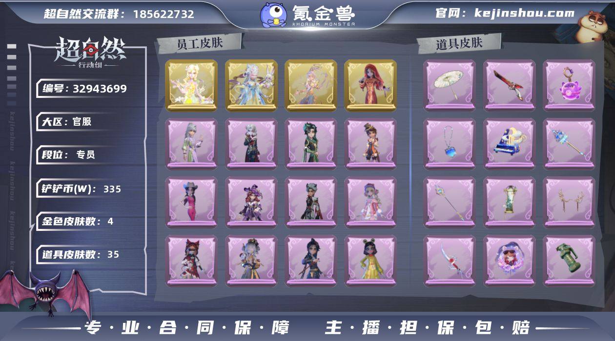 金皮4;紫皮13;道具皮35;皮肤:逍遥-莲华渡,兰-春之声,莉莉-瑶台梦,巫铃儿-镜花辞,兰-千夜星谕,阿念-庆宴绮愿,爱丽丝-耀眼的你,莉莉-莓果陷阱,艾伦-黎明猎手,逍遥-万迭云华,零-磨砺成锋,小黄-呱呱雨衣,爱丽丝-甜梦派对,爱德华-梵卓之礼,零-青云逸歌,逍遥-绣春逍影,莉莉-除妖小师妹;道具:音响-月光奏鸣曲,专业手电-花束般的告白,长鞭-缚誓之锁,刺刀-紫气东来,音响-happy猫,夜视仪-敛花容,铲子-龙鳞,葫芦-伏妖塔,传送按钮-浮生一梦,摸金符-海洋之心,刺刀-碧络琅环,闪光弹-金戈玄铜,折扇-露露扇,腰包-红运福虎,摸金符-紫霄,急救包-蔷薇物语,短管猎枪-安魂曲,短管猎枪-赞萌露比水枪,黄牛能量饮料-青玉抱丹,黄牛能量饮料-雪顶奇愿,摸金符-祝祷词,长枪-波塞冬,闪光弹-邪恶滚滚猫,夜视仪-金丝眼镜,传送按钮-昆仑镜,音响-鸣沙鼓,刺刀-铂刺与红萼,电击枪-甜蜜泡泡枪,急救包-末章心跳,电击枪-权杖的许诺,伞-郁金春信,长枪-罪棘,铲子-赞萌波板糖,长鞭-飞天绫,伞-伞;美妆:美妆-暗夜小恶魔;饰品:头饰-鱼头怪头套,头饰-大葱明头套,头饰-面具马头套,头饰-太空鲨头套,头饰-卑微头套,头饰-小羊的王子梦,头饰-嘻嘻头套,头饰-滑稽头套,头饰-萨卡班甲鱼头套,头饰-火爆了头套,头饰-樱桃奶油...