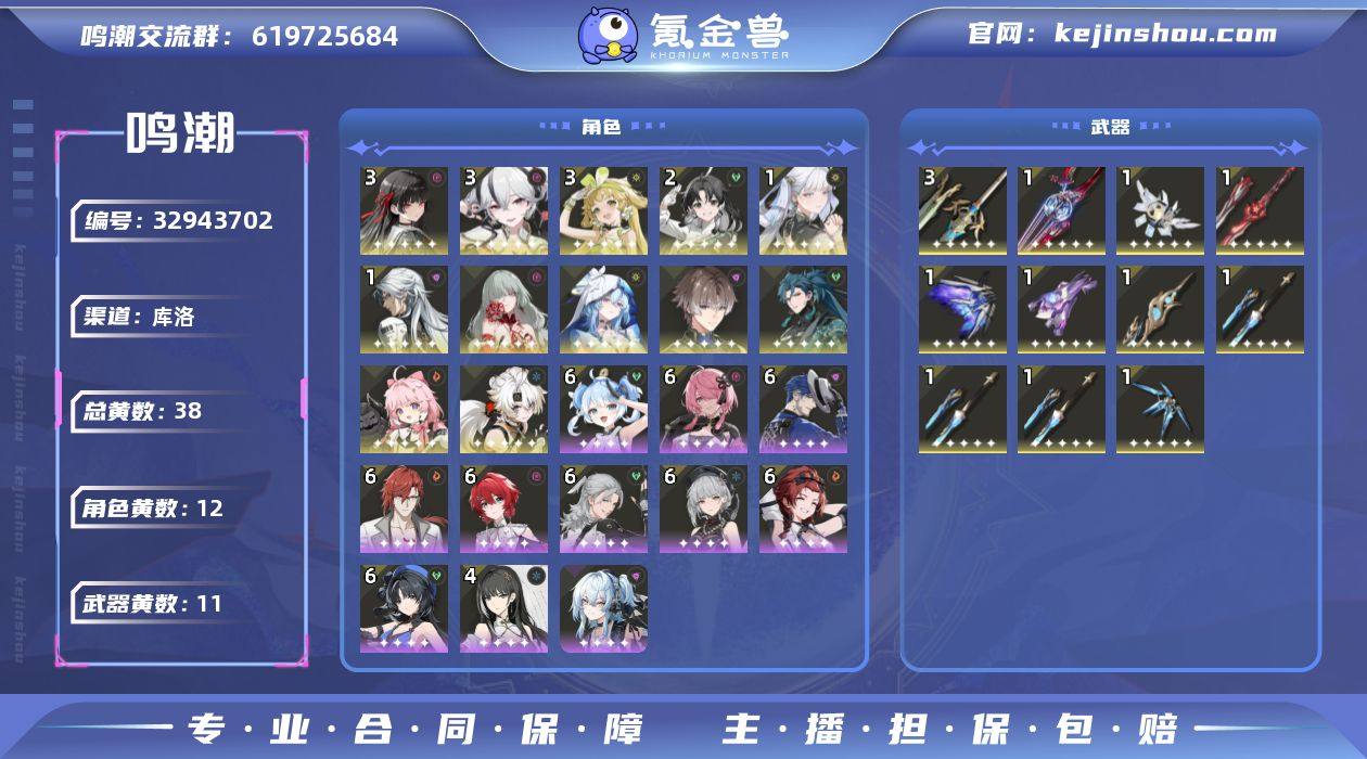 3+1椿,3+1千咲,3维里奈,00弗洛洛,1+1今夕,1+1相里要,0+1守岸人,1卡卡罗,0狮子,0安可,0忌炎,2鉴心,(散华,渊武,桃祁,赤霞,莫菲特,油壶,秋水,丹瑾,央央都是6)3把千古浮流等,赞妮皮肤,菲比武器等,星声100,无金球