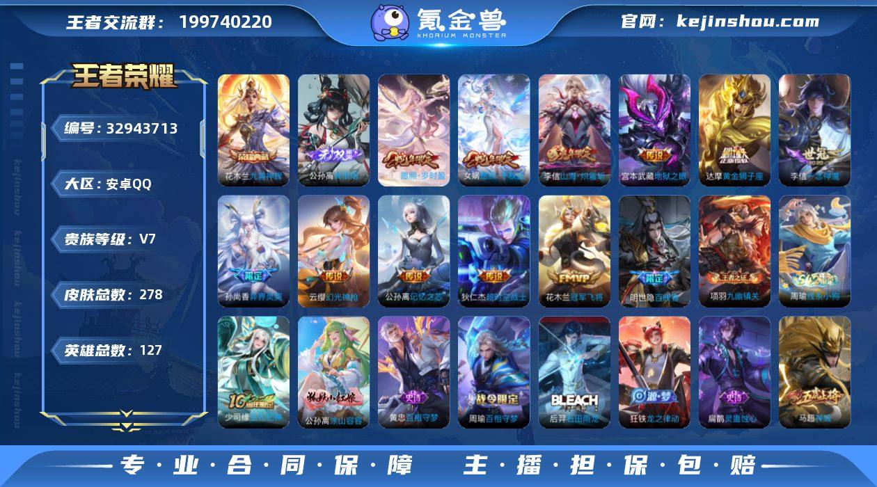 【Hwz1027】【实力号】安卓Q-V7-对抗路58段-发育路49段-1.2W小国扁鹊-万战花木兰-万战项羽-8个省标-12个市标-29个县标-127英雄-278皮肤-1典藏皮肤-1无双-11传说-78史诗(离恨烟、九霄神辉、愿照千秋盛) 【英雄全皮】:孙权全皮,苍全皮,敖隐全皮,蒙恬全皮,空空儿全皮 【荣耀典藏】:花木兰九霄神辉 【无双皮肤】:公孙离离恨烟 【传说皮肤】:女娲愿照千秋盛,虞姬愿照岁时盈,云缨幻光神枪,公孙离记忆之芯,李信山海炽霜斩,孙尚香异界灵契,李信一念神魔,达摩黄金狮子座,花木兰冠军飞将,宫本武藏地狱之眼,狄仁杰超时空战士 【限定皮肤】:公孙离离恨烟,姜子牙天穹之誓,狄仁杰阴阳师,赵云皇家上将,嬴政优雅恋人,孙尚香异界灵契,庄周高山流水,高渐离死亡摇滚,钟无艳超时空战士,扁鹊奇幻香踪,白起夜都怪侠,芈月幻夜卜梦,元歌无心,夏侯惇朔风刀,甄姬落雪兰心,马可波罗山海玄木吟,狄仁杰魔术师,狄仁杰万华元夜,达摩星际陆战队,达摩沙漠行僧,项羽海滩派对,老夫子醍醐杖,程咬金演武夺筹,王昭君午后时光,兰陵王金庭之子,孙悟空孙行者,牛魔御旌,后羿圣弓游侠,李元芳云中旅人,钟馗驱傩正仪,杨玉环遇见飞天,杨戬潮玩骑兵,干将莫邪真爱魔法,...