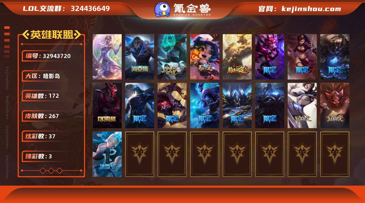 t38917【暗影岛】267皮肤 37炫彩 3臻彩 4神话/37限定/29传说/172英雄 账号等级:598【重要头像】我麦是开的么 KDA萨勒芬妮 可爱安妮 【重要皮肤】胜利行刑官德莱文 胜利之王泰达米尔 电玩女神厄运小姐 玉剑传说无影 玉剑传说舞剑仙 玉剑传说舞龙卫 北辰之威内瑟斯 龙马烈焰波比 胜利女神瑟庄妮 胜利枪神卢锡安 冬季仙境奥莉安娜 圣诞糖果棒厄运小姐 大魔王提莫 FPX墨菲特 iG卡蜜尔 SSG嘉文四世 SSG伊泽瑞尔 SKTT1扎克 SKTT1李青 暗杀星蒙多 Fnatic迦娜 Fnatic古拉加斯 冠军典狱长锤石 冠军掠夺者卡兹克 冠军之隐劫 冠军之志瑞兹 鬼影森森茂凯 红桃杰克崔斯特 女猎手希维尔 圣诞精灵崔丝塔娜 圣诞老人古拉加斯 圣诞驯鹿克格莫 邪恶圣诞老人维迦 英勇玩具兵普朗克 勇者阿狸 机械迷城加里奥 都铎王朝图奇 十周年纪念安妮 源代码乐芙兰 神凰行者瑞羽圣凰艾尼维亚 大元素使拉克丝 【传说皮肤】真实伤害艾克 电玩女神娑娜 律政大亨蒙多 双重冰晶艾尼维亚 红色男爵库奇 女警狙击凯特琳 神龙尊者圣龙李青 合金巨兽努努和威朗普 丧尸布兰德 枯萎之壤泽拉斯 霸天异形卡兹克 血石领主弗拉基米尔 神拳李青 腥红之月鬼武姬阿卡...