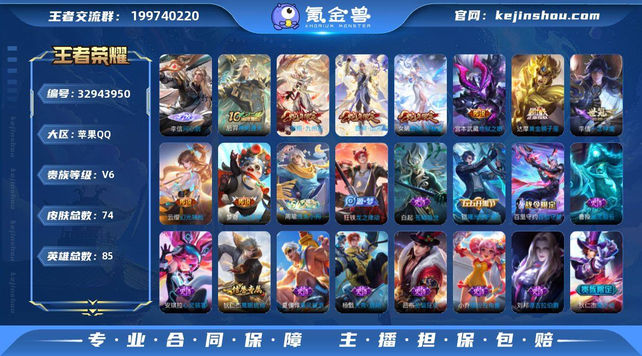 苹果Q-V6-最强王者段位-85英雄-74皮肤-1无双-9传说-18史诗 【英雄全皮】:孙权全皮 【无双皮肤】:李信问心剑 【传说皮肤】:后羿神树通天,司空震愿照山河定,女娲愿照千秋盛,澜愿照九州拓,云缨幻光神枪,李信一念神魔,达摩黄金狮子座,梦奇胖达荣荣,宫本武藏地狱之眼 【限定皮肤】:狄仁杰阴阳师,赵云皇家上将,狄仁杰魔术师,达摩沙漠行僧,项羽海滩派对,钟馗驱傩正仪,鲁班大师探海日志,桑启海盐诗旅 【年限皮肤】:司空震愿照山河定,女娲愿照千秋盛,澜愿照九州拓 【赛季限定】:钟馗驱傩正仪,达摩沙漠行僧,桑启海盐诗旅,鲁班大师探海日志 【战令限定】:百里守约百相守梦,老夫子百相守梦,孙膑茶境仙,马超访茗客,周瑜线条小狗 【史诗皮肤】:周瑜线条小狗,狂铁龙之律动,白起苍鳞隐世,孙膑茶境仙,百里守约百相守梦,哪吒雪上飞焰,杨戬天秀启明,狄仁杰鹰眼统帅,铠曙光守护者,安琪拉心灵骇客,小乔缤纷独角兽,夏侯惇乘风破浪,刘邦德古拉伯爵,曹操幽灵船长,吕布圣诞狂欢,妲己魅力维加斯,狄仁杰魔术师,王昭君偶像歌手,赵云皇家上将 【其他皮肤】:影百相守梦,鲁班七号班班快跑,艾琳鹤鸣心笺,孙权径山谋武,少司缘灵卦秘语,姜子牙星梦巡礼...