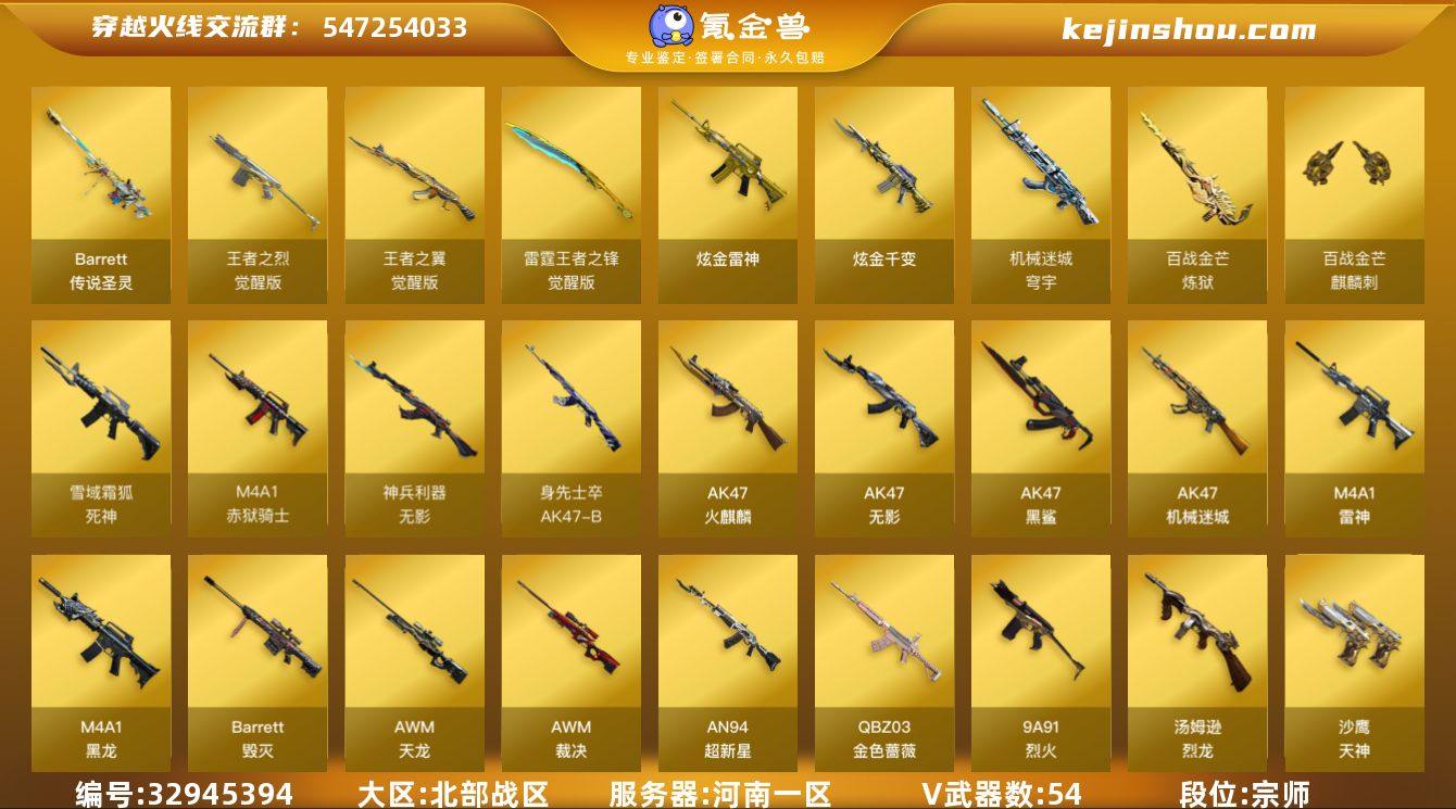河南一区-62V-9王者武器数-2炫金武器数 【传说武器】:传说圣灵 【热门武器】:传说圣灵,QBZ03-金色蔷薇,M200-竞技荣光,汤姆逊-烈龙,裁决-雪莉杨 【王者炫金武器】:高爆手雷-雷霆王者*2,烟雾弹-雷霆王者,闪光弹-雷霆王者,炫金千变,炫金雷神 【音效卡】:AK47-火麒麟音效卡,Barrett-碧霄极光音效卡*3,炼狱-百战金芒-庆典舞曲音效卡,死神-雪域霜狐-怀旧音效卡 【皮肤】:裁决-羽掣 皮肤,雷神-暗月,雷神-能量核心,雷神-诺拉 皮肤,M4A1-再燃火线,AK47-火麒麟-传奇EVEN,火麒麟-心动糖果,毁灭-暗月,毁灭耀金皮肤,毁灭-黑大圣皮肤,毁灭-风暴*2,黑龙-能量核心,无影-能量核心,AWM-天龙-传奇70KG,轻型军用手斧-再燃火线,麒麟刺-甜蜜糖果 皮肤 【角色】:炫,电竞教官-云悠悠,零·纪元,战地猎狐,雪域霜狐,乔伊教练,修道士,葵-阿尔法武装,暗夜-X,初恋灵狐,风暴女,嘉年华灵狐,疾风,灵狐者-X,龙儿,潜龙队-X,斯沃特-X,兔囡囡,维纳斯,雪莉杨-摸金校尉,智影 【人偶武器】:裁决-雪莉杨,火麒麟-灵狐,AWM-灵狐-15周年嘉年华,迷你深渊冰龙,迷你裂空之翼*2,迷你波特博士,迷你牛牛,迷你艾比 【挑战大师】:神圣爆裂者III,激光毁灭者III-白马银...