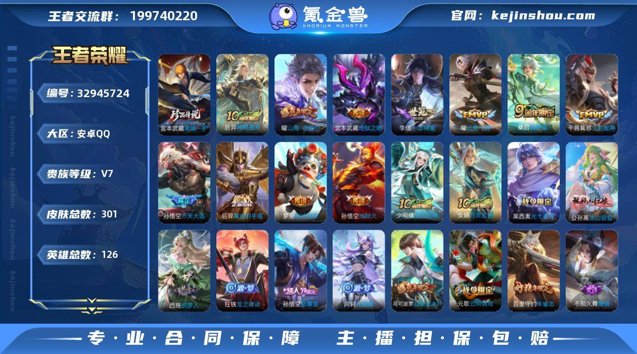 实名: 不可修改 贵族等级: V7 英雄数: 126 皮肤数: 301 珍品传说: 黑崎一护 传说皮: 黄金射手座,云鹰飞将,久胜战神,一念神魔,地狱火,地狱之眼,胖达荣荣,山海·苍雷引,神树通天 限定皮: 李小龙,梁祝,朱雀志,至尊宝,高山流水,五谷丰年,降魔,山海·玄木吟,齐天大圣,鸣野蒿,逐霄战戟
