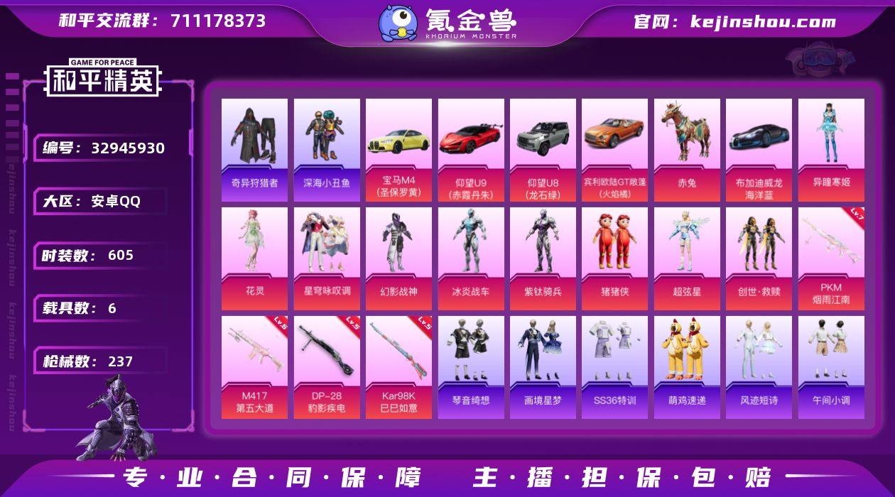 DB4427-安Q-可改实名可转区-有安全提醒-9粉装5枪6载具-连体王者贵8-316皮4(武则天)荣耀典藏23传说2星传说-猪猪侠 幻影战神 花灵 超弦星 星穹咏叹调-螳螂副套-奇异狩猎者 深海小丑鱼 雪山精英 东方飞龙 小丑鱼-PKM江南烟雨7级 M417第五大道6级-宝马M4 仰望U8 布加迪威龙 仰望U9 宾利欧陆GT敞篷 赤兔 安卓手Q-12王牌印记-9粉装-5特效枪-6载具-81750热力值-177套装-237枪皮-5卓越印记-2传奇印记 【9粉装】套装-幻影战神,角色-冰炎战车,角色-花灵,角色-异瞳寒姬,套装-创世·救赎,角色-紫钛骑兵,玩偶服-猪猪侠,角色-超弦星,套装-星穹咏叹调 【5特效枪】DP-28-豹影疾电/5级,PKM-江南烟雨/7级,Kar98K-巳巳如意/5级,M417-第五大道/6级,Mk14-福马献瑞/5级 【11稀有紫装】Mark.06,8号机,奇异狩猎者,深海小丑鱼,雪山精英,六号树人,东方飞龙,小丑鱼,龟仙人,怀庆长公主,暗夜魅影 【6稀有载具】宝马M4(圣保罗黄),仰望U8(龙石绿),布加迪威龙(海洋蓝),仰望U9(赤霞丹朱),宾利欧陆GT敞篷(火焰橘),赤兔 【177稀有时装】幻影战神,猪猪侠,冰炎战车,紫钛骑兵,星穹咏叹调,花灵,异瞳寒姬,创世·救赎,超弦星,奇异狩猎者,龟仙人,Mark.06,雪山精英,深海小丑鱼,小丑鱼,东方飞龙,8号机,六号树人,Alan Walker...