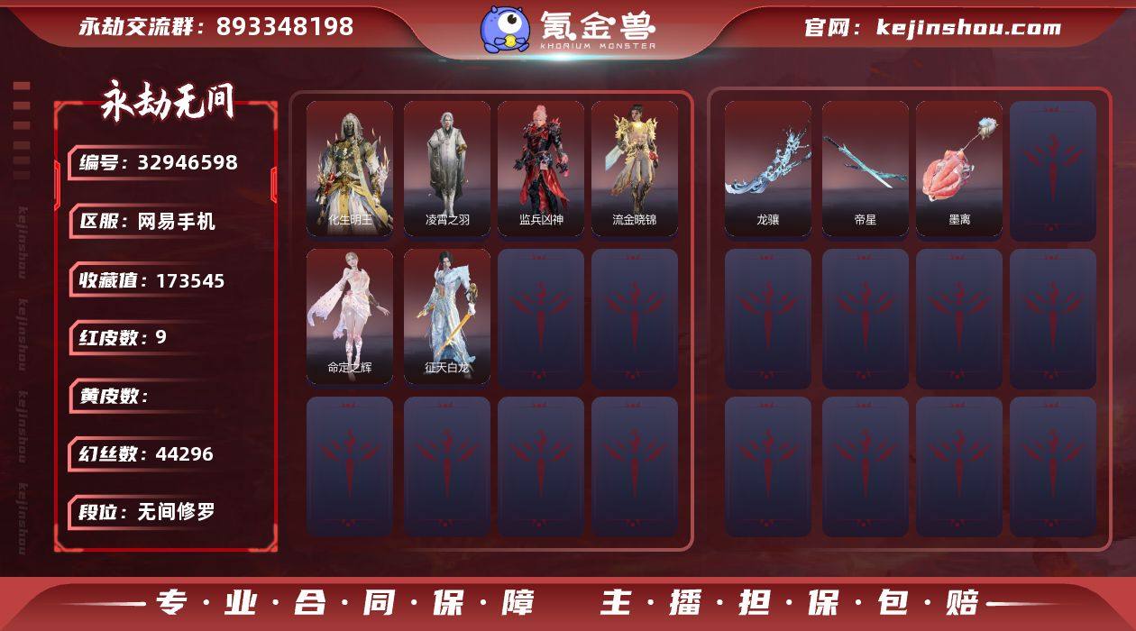 WJ5780,网易手机,4月8日可换绑,9红195金,等级209,收藏值173545,三人段位无间修罗,幻丝44296,金砖164,通行证Lv.132,声望2,红色神品,墨离,监兵凶神,流金晓锦,命定之辉,征天白龙,化生明王,凌霄之羽,龙骧,帝星,角色金色皮肤,赤焰舞影,浣烟纱,不败擂主,悠竹萌客,幽夜玲珑,妲己,塔罗序衔环,天工奥妙,寿竹云春,极夜天曦,赤诚心,姜子牙,孤影戎装,云间影,山漠狞影,墨游痕,承武禅法,觉明尊者,九骊之君,八宝龙王,萍之缘,唐三,碧水青天,昆仑圣女,妖刀姬,赤雾烟霞,狐踪,申公豹,剪春漪,龙吉公主,武器金色皮肤,朱雀,戏祥云,雨幕,兔华笼,连霆,丹鹤,凝冰魄,鹦鹉螺,心魔,刑度,乌木弓,腥红之月,秉青,百战惊锋,镇恶天下第一蓄转振,醒狮,毛乎乎,天狐,