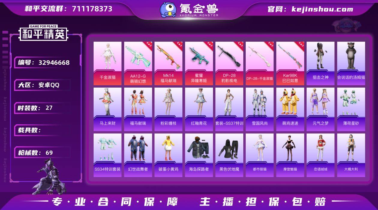 【6特效枪1粉装 秒换绑不用等】 安卓Q区-16486热力值-27套装-69枪皮 【1粉装】 角色-千金淑猫【6特效枪】 Mk14-福马献瑞(5级) AA12-G-萌骑幻想(3级) DP-28-千金淑猫(4级) 蜜獾-异瞳寒姬(5级) Kar98K-巳巳如意(5级) DP-28-豹影疾电(5级)【69热门】 M762-天降萌叽 SKS-糯团青竹 DBS-彩虹符号 MG3-幻世战舞者 破蛋小黄鸡 黑色伏地魔 海岛探路者 S1897-糯团青竹 MK20-H-樱桃泡泡 AA12-G-雨过天青 沙漠之鹰-雨过天青 P90-紫矿核心 GROZA-紫矿核心 M16A4-雨过天青 SPAS-12-福马献瑞 雨过天青 MG-36-薄荷星砂 恋语绒绒 SS34特训 福马献瑞 大橘大利 ACE32-冰晶雪宝 PKM-啾咪啾咪 大砍刀-像素花束 MG3-火熔核心 战术大师 马上来财 蜜獾-启元战纹 狙击之神 UMP45-海盐豹豹 ARX-像素花束 Mk14-紫晶流影 汤姆逊-绒绒猫尾 M249-绒绒猫尾 AUG-紫晶流影 燃烧瓶-福马献瑞 GROZA-海盐豹豹 M16A4-千金淑猫 M16A4-绒绒猫尾 AKM-涂鸦街区 S686-千金淑猫 爆炸猎弓-喜羊羊与灰太狼 蝎式手枪-千金淑猫 玩偶服-会说话的汤姆猫 SCAR-L-彩虹符号 摩登魅猫 元气之梦 都市丽猫 S12K-霓彩脉冲 十字弩-异域银装 雪国风尚 粉彩缠枝 破片手榴弹-拽到爆炸 十字弩-异瞳寒姬 Famas-霓彩脉冲 S12K-极意拳锋 SLR-霓...