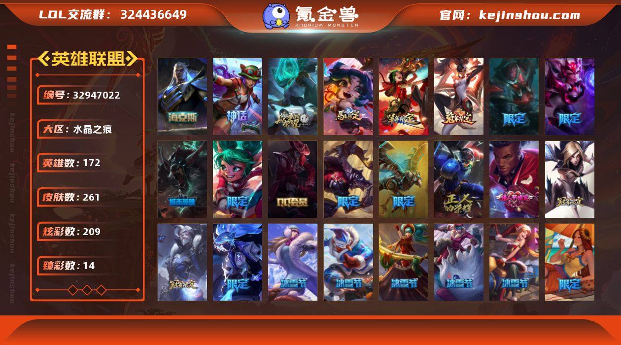 t38978【水晶之痕】261皮肤 209炫彩 14臻彩 5神话/44限定/22传说/172英雄 账号等级:355 云顶神话:1 单双排段位:铂金 【重要头像】星守阿狸 云顶古琴娑娜 觅心游侠卢锡安 幼犬沃里克 送披萨的小姐姐希维尔 此志无双羽饰骑士 圣诞捣蛋鬼金克丝 【重要皮肤】海克斯科技斯维因 胜利女神娑娜 胜利之王泰达米尔 胜利巨口克格莫 舞会公主安妮 玉剑传说舞龙卫 点心宝贝阿木木 天龙之子斯莫德 剪纸仙灵希维尔 神龙烈焰金克丝 龙马烈焰波比 胜利女神瑟庄妮 胜利机器人布里茨 胜利女神奥莉安娜 胜利枪神格雷福斯 胜利枪神卢锡安 胜利之剑亚托克斯 持胡萝卜的雪人易 冰雪女神辛德拉 魄罗骑士瑟庄妮 平安夜女神娑娜 小恶魔菲兹 泳池派对格雷福斯 泳池派对蕾欧娜 DRX阿卡丽 EDG格雷福斯 iG卡莎 SKTT1阿利斯塔 SSW雷恩加尔 Fnatic迦娜 Fnatic古拉加斯 冰雪节辛吉德 防暴天使凯尔 钢铁之翼艾尼维亚 红桃杰克崔斯特 圣诞精灵崔丝塔娜 圣诞驯鹿克格莫 幸福女神乐芙兰 勇者阿狸 征服者诺提勒斯 暗影沃里克 波比的巧克力工坊 都铎王朝图奇 十五周年纪念希维尔 十周年纪念安妮 源代码乐芙兰 神凰行者瑞羽圣凰艾尼维亚 胜利凤凰艾尼维亚...