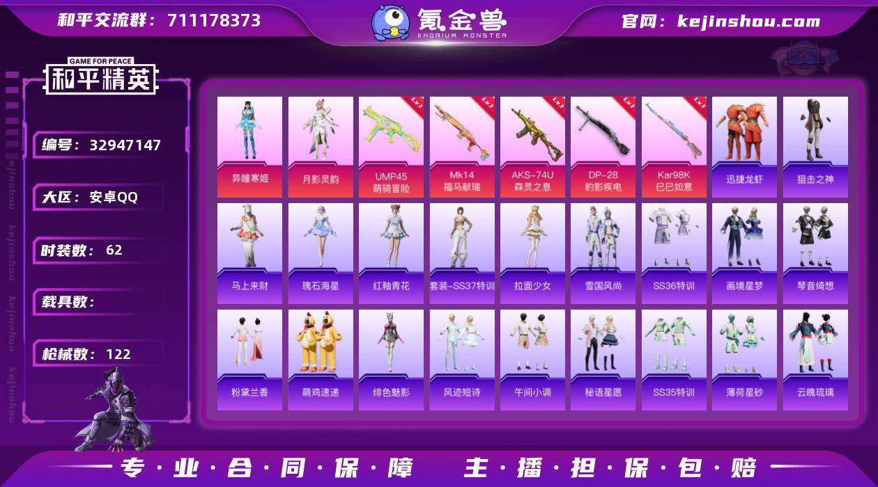 【5特效枪2粉装 秒换绑不用等】 安卓Q区-30575热力值-62套装-122枪皮 【2粉装】 角色-异瞳寒姬 角色-月影灵韵【5特效枪】 AKS-74U-森灵之息(5级) Mk14-福马献瑞(5级) UMP45-萌骑冒险(4级) Kar98K-巳巳如意(5级) DP-28-豹影疾电(5级)【144热门】 SCAR-L-玉兔迎春 GROZA-田园牧歌 M762-天降萌叽 M762-彩虹符号 DBS-彩虹符号 M249-彩虹符号 MG3-幻世战舞者 AKM-星之彼岸 M416-蓝色火焰 长空猛禽 魅力单车 黑色伏地魔 海岛探路者 风暴特警 春日漫步 S1897-糯团青竹 AA12-G-雨过天青 沙漠之鹰-雨过天青 平底锅-画境星梦 P90-紫矿核心 GROZA-紫矿核心 M16A4-雨过天青 AC-VAL-玩趣呆呆 顶瓜瓜 雨过天青 瑰石海星 MG-36-薄荷星砂 GROZA-福马献瑞 恋语绒绒 SS34特训 GROZA-拉面少女 蜜獾-鸡智如我 星渊小夜曲 大橘大利 M200-罪夜之冕 燃点复合弓-罪夜之冕 蓝冰羽 SPAS-12-罪夜之冕 破片手榴弹-爆破雪人 SS30特训 ACE32-冰晶雪宝 青团波波 鱼渊荷华 光矢逐梦 糖糖葫芦 PKM-啾咪啾咪 燕燕于飞 SS31特训 SS33特训 SS32特训 巳巳如意 紫幽梦 棉花软糖 绯色魅影 MG3-霓彩脉冲 粉黛兰香 狂鲨锋刃 SS36特训 大砍刀-像素花束 MG3-火熔核心 异域银装 Vector-英伦信使 战术大师 绒宝小鹅 马上来财...