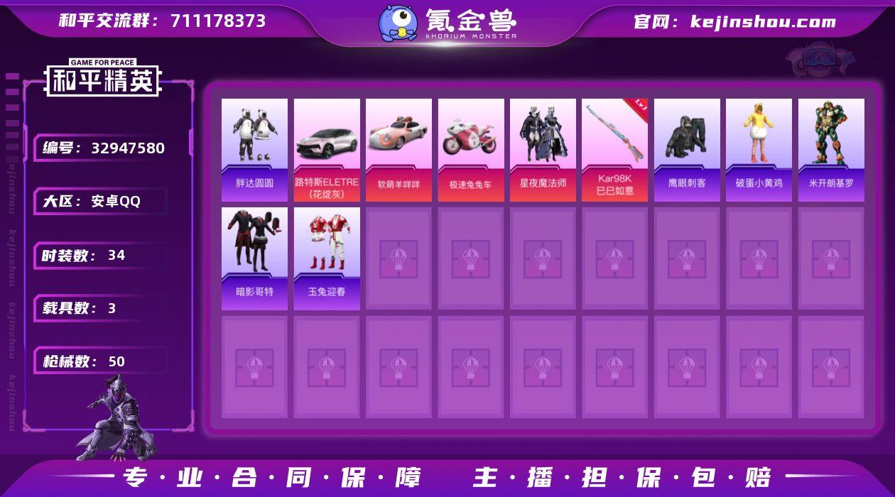 M1047376【3载具-1粉装-1特效枪胖达圆圆,暗影哥特】无二次包 安卓手Q-3载具-1粉装-1特效枪-34套装-50枪皮-1王牌印记-坚韧铂金Ⅴ-17614热力值【3载具】软萌羊咩咩,路特斯ELETRE(花绽灰),极速兔兔车【1粉装】星夜魔法师【1特效枪】Kar98K-巳巳如意[4级]【2稀有】胖达圆圆,暗影哥特【1飞行器】星夜魔法师飞行翼【80其它衣服和枪皮】灼焰舞者,SS22特训,海岛探路者,狙击之神,智慧隐士,鹰眼刺客,猛禽,SS30特训,长空猛禽,战术大师,轻风白浪,虚音幻奏,角色-米开朗基罗,猎梦纪元,竞技名士,田园牧歌,街头潮人,甜心亚梦,SS23特训,牛气冲天,龙魂突击队,SS38特训,黑色伏地魔,黄色名流,幻世战舞者,破蛋小黄鸡,白色伏地魔,魅力单车,玉兔迎春,SS21特训,SS33特训,UZI-红色方程式,Mini14-耀粉歌者,VSS-田园牧歌,M16A4-甜心亚梦,平底锅-田园牧歌,ACE32-冰晶雪宝,M16A4-冰河战士,Mk47-乌木金纹,S12K-幻世战舞者,AUG-耀粉歌者,汤姆逊-耀粉歌者,DP-28-甜心亚梦,GROZA-田园牧歌,Mini14-星夜魔法师,UMP45-生命誓言,SPAS-12-田园牧歌,AKM-筑梦精灵,M24-炫彩节奏,莫辛纳甘-乌木金纹,M416-红色方程式,SCAR-L-兔兔白日梦,Kar98K-红色方程式,SCAR-L-玉兔迎春,M249-糯团青竹,蜜獾-天降萌叽,平底锅-光之冒险,P9...