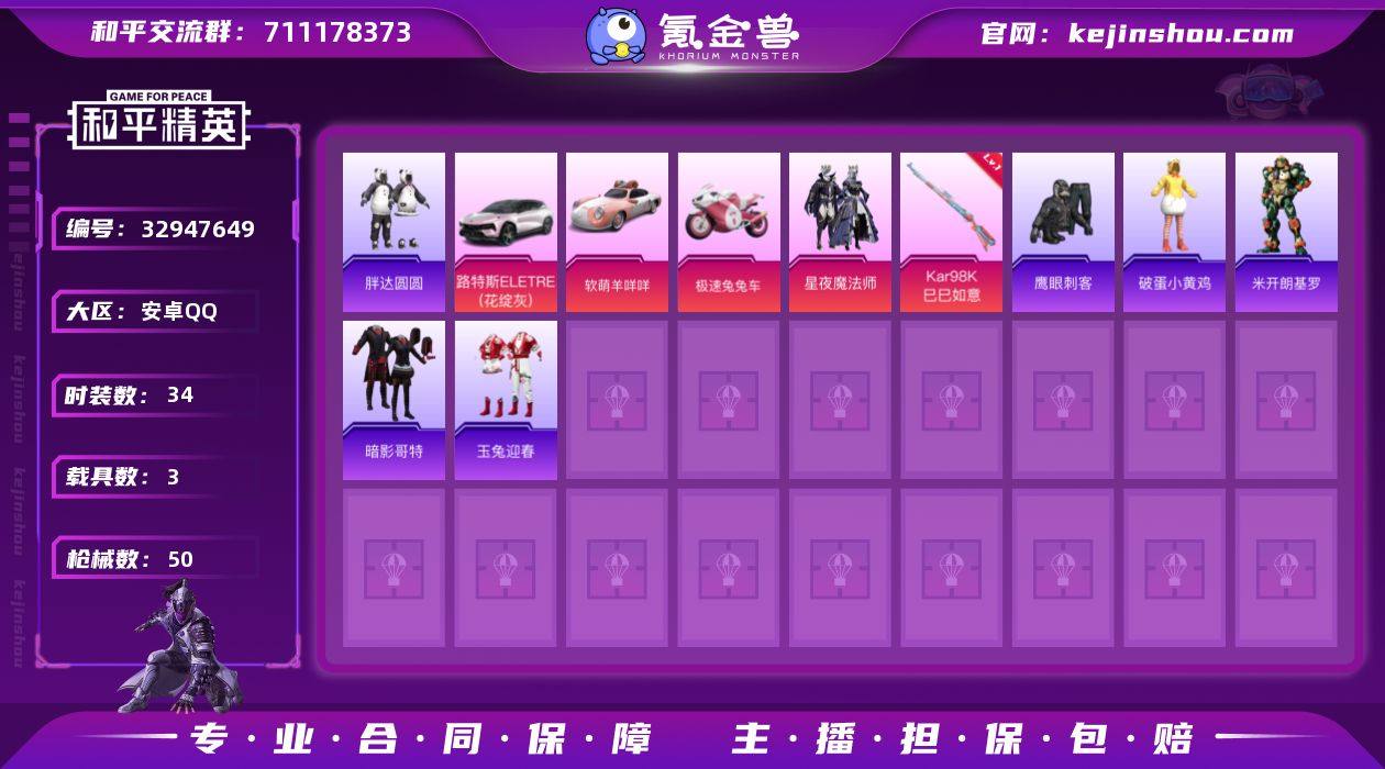 M1047376【3载具-1粉装-1特效枪胖达圆圆,暗影哥特】无二次包 安卓手Q-3载具-1粉装-1特效枪-34套装-50枪皮-1王牌印记-坚韧铂金Ⅴ-17614热力值【3载具】软萌羊咩咩,路特斯ELETRE(花绽灰),极速兔兔车【1粉装】星夜魔法师【1特效枪】Kar98K-巳巳如意[4级]【2稀有】胖达圆圆,暗影哥特【1飞行器】星夜魔法师飞行翼【80其它衣服和枪皮】灼焰舞者,SS22特训,海岛探路者,狙击之神,智慧隐士,鹰眼刺客,猛禽,SS30特训,长空猛禽,战术大师,轻风白浪,虚音幻奏,角色-米开朗基罗,猎梦纪元,竞技名士,田园牧歌,街头潮人,甜心亚梦,SS23特训,牛气冲天,龙魂突击队,SS38特训,黑色伏地魔,黄色名流,幻世战舞者,破蛋小黄鸡,白色伏地魔,魅力单车,玉兔迎春,SS21特训,SS33特训,UZI-红色方程式,Mini14-耀粉歌者,VSS-田园牧歌,M16A4-甜心亚梦,平底锅-田园牧歌,ACE32-冰晶雪宝,M16A4-冰河战士,Mk47-乌木金纹,S12K-幻世战舞者,AUG-耀粉歌者,汤姆逊-耀粉歌者,DP-28-甜心亚梦,GROZA-田园牧歌,Mini14-星夜魔法师,UMP45-生命誓言,SPAS-12-田园牧歌,AKM-筑梦精灵,M24-炫彩节奏,莫辛纳甘-乌木金纹,M416-红色方程式,SCAR-L-兔兔白日梦,Kar98K-红色方程式,SCAR-L-玉兔迎春,M249-糯团青竹,蜜獾-天降萌叽,平底锅-光之冒险,P9...