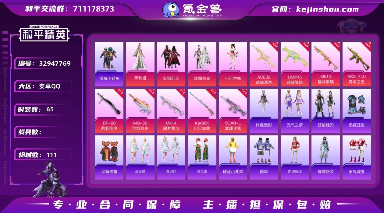 M1047375【身法号4粉装-9特效枪 小可学妹 深海小丑鱼 SCAR-L-童趣迷兔[6级]】无二次包 安卓手Q-4粉装-9特效枪-65套装-111枪皮-4王牌印记-不朽星钻Ⅴ-30572热力值【4粉装】角色-小可学妹,炙焰红王,角色-萨利娅,冰霜白皇【9特效枪】MG-36-沧焰双生[5级],Kar98K-巳巳如意[5级],Mk14-甜梦熊击[5级],DP-28-豹影疾电[5级],SCAR-L-童趣迷兔[6级],UMP45-萌骑冒险[4级],ACE32-萌骑漫游[4级],Mk14-福马献瑞[2级],AKS-74U-森灵之息[4级]【2稀有】深海小丑鱼,AKM-缤纷海【8飞行器】狂鲨锋刃飞行器,登顶巅峰飞行器,异域银装飞行器,破刃行动尾迹,炫彩糖果飞行器,鸡智如我飞行器,童趣迷兔飞行器,马上有福飞行器【2头盔】深海小丑鱼头盔,童趣迷兔头盔【161其它衣服和枪皮】酒红色名流,SS38特训,漫游都市,旭日情侣,萌鸡速递,街头潮人,雪绒豹,马上有钱,SS32特训,魅力单车,雪国风尚,雨过天青,黄色运动,冷酷挑战者,元素星魂,鹤鸣,街头风暴,SS35特训,SS34特训,狂鲨锋刃,角色-魂电,破蛋小黄鸡,角色-绯色魅影,角色-星际旅行,红釉青花,漫步者,风迹短诗,迅捷狂鲨,核芯基因,玉兔迎春,狙击之神,擎苍青焰,秘语星愿,SS36特训,香桃花海,海岛探路者,炫彩糖果,SS37特训,长空猛禽,元气之梦,恋语绒绒,云朵鹅,王牌...