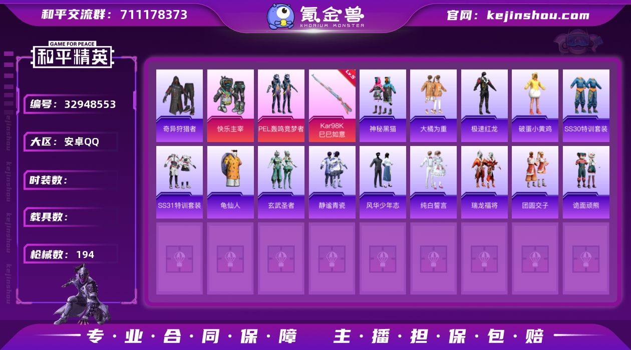 安卓Q 可二次 2粉装4特效枪108套装194枪皮 奇异狩猎者 梦幻火箭 PEL轰鸣竞梦者 AKS-74U-森灵之息(5级) Kar98K-巳巳如意(5级) Mk14-福马献瑞(4级) ACE32-萌骑漫游(4级) 梦幻火箭头盔 甜蜜誓约头盔 金风玉露背包 神秘黑猫背包 金羽特工背包 甜蜜誓约背包 夏日绵绵冰背包 龟仙人 大橘为重 神秘黑猫 诡面顽熊 团圆交子 瑞龙福将 纯白誓言 玄武圣者 静谧青瓷 破蛋小黄鸡 风华少年志 极速红龙 AKM-奇异狩猎者 M762-奇异狩猎者 M762-瑞龙福将 M24-奇异狩猎者 S686-奇异狩猎者 和平精英账号