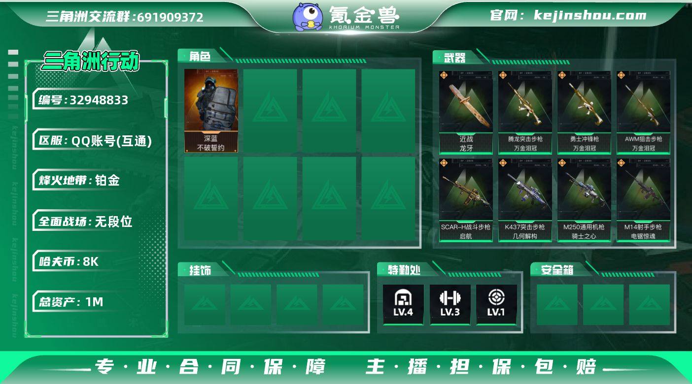 【sjz6067】1m总资产-8k哈夫币-60烽火等级-铂金-4战场等级-无军衔 【干员外观】:深蓝-不破誓约 【近战皮肤】:近战-龙牙,近战-黑鹰 【传说外观】:M4A1突击步枪-黑暗力量,SCAR-H战斗步枪-启航,腾龙突击步枪-捞点薯条,腾龙突击步枪-万金泪冠,K437突击步枪-几何解构,Vector冲锋枪-能天使-午夜邮差,勇士冲锋枪-能天使-午夜邮差,勇士冲锋枪-万金泪冠,M250通用机枪-骑士之心,M14射手步枪-电锯惊魂,AWM狙击步枪-捞点薯条,AWM狙击步枪-万金泪冠,93R-捞点薯条 【史诗外观】:ASh-12战斗步枪-星际探索,ASh-12战斗步枪-无极限,AUG突击步枪-蝮蛇,K437突击步枪-守护者,MP5冲锋枪-战术竞备,MP5冲锋枪-竞技风,Vector冲锋枪-阿萨拉文明,SR-3M紧凑突击步枪-战术竞备,MP7冲锋枪-守护者,MP7冲锋枪-六套之力,S12K霰弹枪-曙光,PKM通用机枪-蝮蛇,PKM通用机枪-阿萨拉特攻,M250通用机枪-囚徒,QJB201轻机枪-炽焰,Mini-14射手步枪-守护者,M14射手步枪-工业狂潮,SV-98狙击步枪-林中猎手,SV-98狙击步枪-囚徒,AWM狙击步枪-无极限,复合弓-守护者 【稀有外观】:M4A1突击步枪-银灰金属,PKM通用机枪-黑潮,M7战斗步枪-天际线,SG552突击步枪-天际线,AUG突击步枪-旧梦,SR...