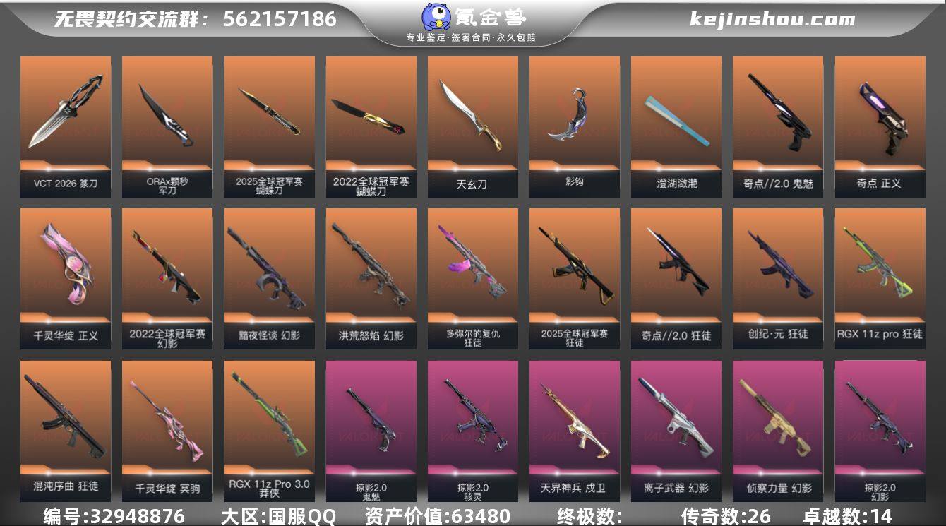 【自带包赔 可赔三倍】:库存价值63480 【限定】: VCT 2026 篆刀, 2025全球冠军赛 狂徒, 2025全球冠军赛 蝴蝶刀, 2022全球冠军赛 幻影, 2022全球冠军赛 蝴蝶刀 【近战】: 天玄刀, ORA x 颗秒 军刀, VCT 2026 篆刀, 2025全球冠军赛 蝴蝶刀, 影钩, 2022全球冠军赛 蝴蝶刀, 澄湖潋滟 【狂徒】: 多弥尔的复仇 狂徒, 掠影 狂徒, 般若假面//2.0 狂徒, 2025全球冠军赛 狂徒, 盖亚的复仇 狂徒, 奇点//2.0 狂徒, 创·纪元 狂徒, RGX 11z Pro 狂徒, 混沌序曲 狂徒, 耀鳞威龙 狂徒 【幻影】: 侦察力量 幻影, 掠影//2.0 幻影, 2022全球冠军赛 幻影, 黯夜怪谈 幻影, 洪荒怒焰 幻影, 离子武器 幻影 【冥驹】: 堕天遗武 冥驹, 千灵华绽 冥驹, 盖世英雄 冥驹 【正义】: 奇点 正义, 千灵华绽 正义 【戍卫】: 天界神兵 戍卫 【鬼魅】: 掠影//2.0 鬼魅, 奇点//2.0 鬼魅 【骇灵】: 掠影//2.0 骇灵 【奥丁】: 掠影//2.0 奥丁 【莽侠】: RGX 11z Pro//3.0 莽侠 【概要】: 总皮肤 127 终极 0 传奇 26 卓越 14 刀皮 英雄 29 LV 153 历史最高:钻石 当前段位:黄金二 已使用 1395 R点 剩余 30 R点 卡面、挂饰、其他皮肤请看截图 道具、段位等以实际验号为准。如账号因没有维护,赛季更新...