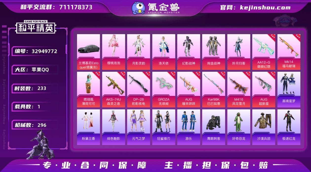 实名: 可修改 时装数: 233 载具数: 1 枪械数: 296 热门装扮: 幻影战神,鹰眼刺客,好奇恐龙,绚金战神,吟月归客,洛天依,月影灵韵,樱桃泡泡 载具: 兰博基尼Estoque(银翼灰) 稀有枪皮: M416风花雪月,AUG超新星,Kar98K-巳巳如意,AUG-暖羊咩咩,GROZA-无垠阁,DP-28-豹影疾电,燃烧瓶-薄荷可可,AKS-74U-森灵之息,MK14-福马献瑞,AA12-G-萌骑幻想
