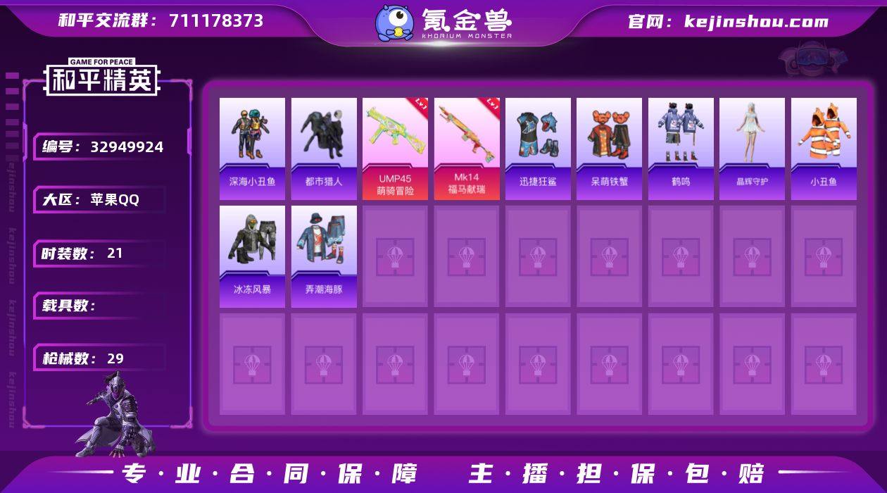 M1047370【身法号2特效枪小丑鱼,深海小丑鱼,都市猎人】无二次包 苹果手Q-2特效枪-21套装-29枪皮-1王牌印记-不朽星钻Ⅴ-8088热力值【2特效枪】Mk14-福马献瑞[5级],UMP45-萌骑冒险[2级]【4稀有】小丑鱼,深海小丑鱼,都市猎人,AKM-缤纷海域【2飞行器】霓裳阁主飞行器,云朵驼驼飞行器【1头盔】深海小丑鱼头盔【1背包】深海小丑鱼背包【44其它衣服和枪皮】福马献瑞,弄潮海豚,鹤鸣,红釉青花,晶辉守护,阳光菠萝,雨过天青,完美偶像,SS37特训,龙魂突击队,马上有钱,黑色伏地魔,呆萌铁蟹,军械专家,迅捷狂鲨,冰冻风暴,疯狂小兔子,狙击之神,GROZA-福马献瑞,破片手榴弹-海盐豹豹,Vector-彩虹符号,M249-莲影清波,汤姆逊-像素花束,AUG-耀粉歌者,P90-玩趣呆呆,SKS-迅猛狂鲨,M416-糯团青竹,AA12-G-雨过天青,MP5K-天马神君,SKS-炫彩节奏,AWM-天降萌叽,沙漠之鹰-雨过天青,UZI-影袭,Mini14-穿刺龙虾,Mk14-幻星舰长,M16A4-雨过天青,PKM-雨过天青,蜜獾-天降萌叽,M24-炫彩节奏,DBS-圣堂之誓,蜜獾-启元战纹,AMR-雨过天青,Mini14-香桃花海,SLR-乌木金纹