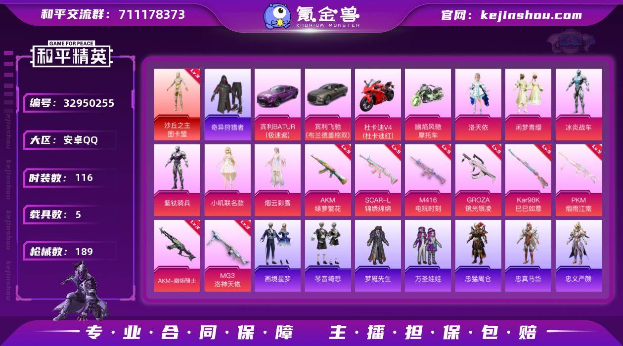 安卓 手Q-1神装-7粉装-11特效枪-5载具-5粉色飞行器-64253热力值-10王牌印记-116套装-189枪皮【红色神装等级】:沙丘之主-图卡盟(三级)【红色角色神装】:沙丘之主-图卡盟【热门品类】:套装-奇异狩猎者,角色-忠猛周仓,角色-忠真马岱,角色-忠义严颜,套装-龟仙人【粉色套装】:角色-洛天依,粉装-闲梦青缨,角色-冰炎战车,角色-紫钛骑兵,角色-小叽联名款,角色-烟云彩露,角色-回旋牧梦使【粉色枪皮等级】:AKM-绿萝繁花(五级),AKM-幽焰骑士(三级),AKM-暮色玫影(三级),SCAR-L-锦绣绵绵(五级),M416-电玩时刻(五级),GROZA-镜光银凌(五级),AKS-74U-森灵之息(五级),Kar98K-巳巳如意(五级),Mk14-福马献瑞(一级),MG3-洛神天依(三级),PKM-江南烟雨(五级)【粉色载具】:宾利BATUR(极速紫),宾利飞驰(布罗德盖棕双色),杜卡迪 Panigale V4(杜卡迪红),幽焰风驰摩托车,暮色幽蹄【粉色枪皮】:AKM-绿萝繁花,AKM-幽焰骑士,AKM-暮色玫影,SCAR-L-锦绣绵绵,M416-电玩时刻,GROZA-镜光银凌,AKS-74U-森灵之息,Kar98K-巳巳如意,Mk14-福马献瑞,MG3-洛神天依,PKM-江南烟雨【粉色飞行器】:镜光幻境飞行翼,镜域双华-灵镜之阶,幽焰列车飞行器,万象金身飞行器,暮色...