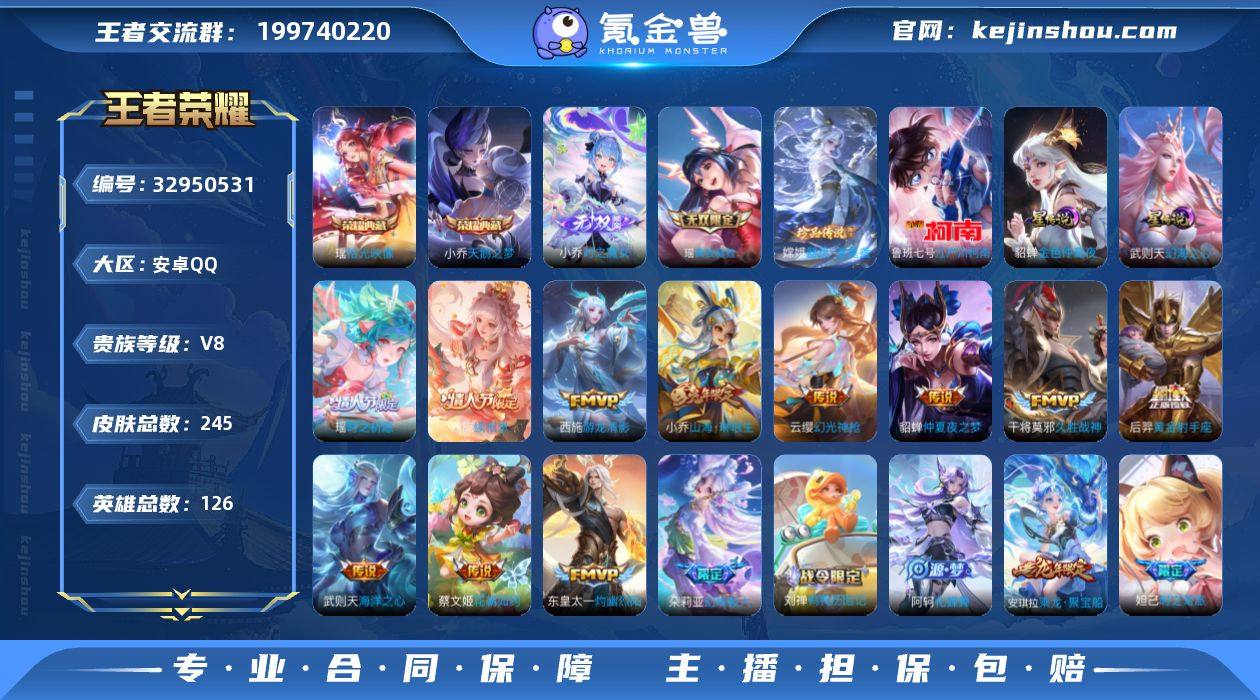 贵族8/皮肤245/典藏2/传说21/史诗68/英雄126/敖隐全皮/小乔-天鹅之梦/瑶-拾光映像/小乔-时之魔女/瑶-真我赫兹/貂蝉-金色仲夏夜/武则天-幻海之心/嫦娥-器灵·落星盏/鲁班七号-江户川柯南/朵莉亚神骥鸣幻洲/貂蝉神骥聚万邦/西施-续相思/司空震-愿照·山河定/女娲-愿照·千秋盛/妲己-愿照·众生和/澜-愿照·九州拓/蔡文姬-愿照·福禄聚/虞姬-愿照·岁时盈/云缨-幻光神枪/桑启-鸣野蒿/东皇太一-灼幽烈阳/小乔-山海·琳琅生/蔡文姬-花朝如约/瑶-时之祈愿/西施-游龙清影/虞姬-启明星使/干将莫邪-久胜战神/后羿-黄金射手座/貂蝉-仲夏夜之梦/武则天-海洋之心/蔡文姬-夏日便利店/虞姬-夏日便利店/姜子牙-天穹之誓/李白-谪仙醉月/狄仁杰-阴阳师/赵云-皇家上将/妲己-时之彼端/妲己-时之奇旅/孙尚香-蔷薇恋人/庄周-高山流水/元歌-无心/狄仁杰-魔术师/狄仁杰-万华元夜/达摩-沙漠行僧/项羽-海滩派对/安琪拉-魔法小厨娘/兰陵王-金庭之子/李元芳-匿光侦查者/李元芳-云中旅人/鬼谷子-原初探秘者/鬼谷子-五谷丰年/沈梦溪-大漠名商/裴擒虎-擒涛扼浪/瑶-山海·碧波行/云中君-纤云弄巧/嫦娥-拒霜思/嫦娥-暖冬·兔眠/西施-至美·乘鲤谣/鲁班大师-探海日志/桑启-海盐诗旅/阿古朵-江河有灵/张良-古海寻踪/蒙犽-百...