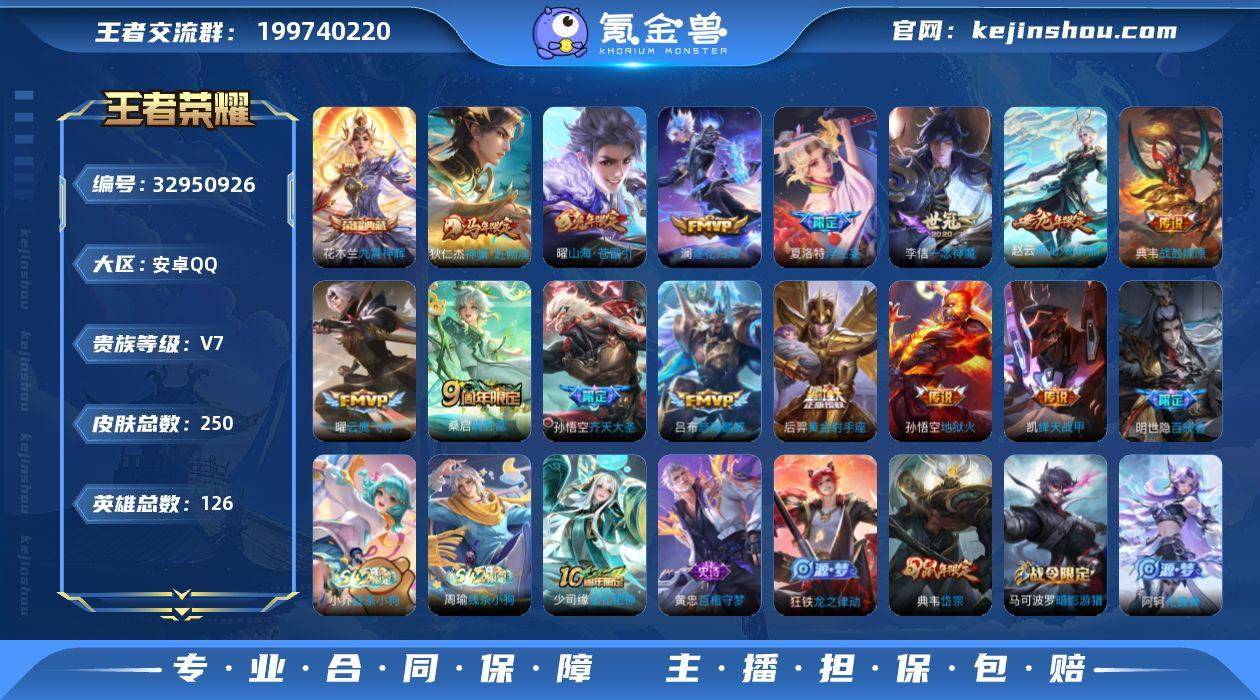 V7-最强王者段位-126英雄-250皮肤-1荣耀典藏-1星传说-14传说-64史诗 【英雄全皮】:夏洛特全皮 【荣耀典藏】:花木兰九霄神辉 【传说皮肤】:狄仁杰神骥赴朔漠,桑启鸣野蒿,典韦战鼓燎原,赵云乘龙铭钟鼎,澜逐花归海,夏洛特浮生妄,孙悟空齐天大圣,曜山海苍雷引,吕布怒海麟威,铠绛天战甲,曜云鹰飞将,李信一念神魔,后羿黄金射手座,孙悟空地狱火 【限定皮肤】:姜子牙天穹之誓,狄仁杰阴阳师,赵云皇家上将,高渐离死亡摇滚,扁鹊奇幻香踪,元歌无心,典韦岱宗,马可波罗暗影游猎,马可波罗山海玄木吟,狄仁杰魔术师,项羽海滩派对,孙悟空齐天大圣,李元芳云中旅人,钟馗驱傩正仪,杨戬潮玩骑兵,蔡文姬繁星吟游,苏烈千军破阵,裴擒虎李小龙,裴擒虎擒涛扼浪,云中君纤云弄巧,嫦娥拒霜思,嫦娥暖冬兔眠,曜山海苍雷引,西施玲珑珍味,鲁班大师探海日志,桑启海盐诗旅,夏洛特浮生妄,暃星界游侠,戈娅驭风魔法,阿古朵江河有灵,张良古海寻踪,蒙犽百解令,鬼谷子天穹祈灯,姬小满妄想食味,赵云乘龙铭钟鼎,沈梦溪龙舞盛年,鲁班七号蔬乡物语,李元芳蔬乡物语,刘邦剑破天穹,周瑜熔金海岸 【年限皮肤】:典韦岱宗,曜山海苍雷引,马可波罗山海玄木吟,赵云乘龙铭...