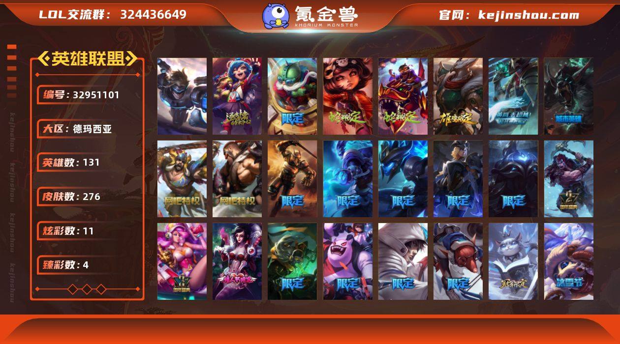 未定级段位-131英雄-276皮肤-11炫彩-1终极-2神话-44限定-26传说-66史诗 【神话皮肤】:十周年纪念安妮,神凰行者瑞羽圣凰艾尼维亚 【臻彩皮肤】:冠军之隐劫凯旋圣装,可爱可爱粉红红布里茨,魔女阿卡丽虚荣,净雪之月莫甘娜冬虹 【年限皮肤】:定海神珍孙悟空,你看见过我的熊猫吗安妮,碧玉之牙卡西奥佩娅,神龙之翼库奇,司马懿仲达 【情人节限定】:觅心猎手薇恩,觅心之翼奎因 【冰雪限定】:幸福女神乐芙兰,圣诞开心鬼提莫,圣诞狂欢努努和威朗普,圣诞糖果棒厄运小姐,圣诞狂欢基兰,胡桃夹子萨科,英勇玩具兵普朗克,冬季仙境卡尔玛,邪恶圣诞老人维迦,喜庆之树茂凯,圣诞玩偶波比,圣诞驯鹿克格莫,魄罗骑士瑟庄妮,冰雪节辛吉德,冰雪兽纳尔 【终极皮肤】:未来战士伊泽瑞尔 【限定皮肤】:舞会公主安妮,地底世界崔斯特,冠军典狱长锤石,冠军之血希瓦娜,冠军之矛卡莉丝塔,冠军之隐劫,Fnatic卡尔萨斯,暗杀星努努和威朗普,SSW图奇,SSW泰隆,EDG悠米,勇敢的心德莱厄斯,电玩女神厄运小姐,鬼影森森茂凯,无头骑士赫卡里姆,泳池派对厄运小姐,泳池派对菲奥娜,外星装甲库奇,暗影沃里克,野兽猎人德莱文,野兽猎人泰达米尔,警用试作体K9内瑟斯 【传说皮肤...