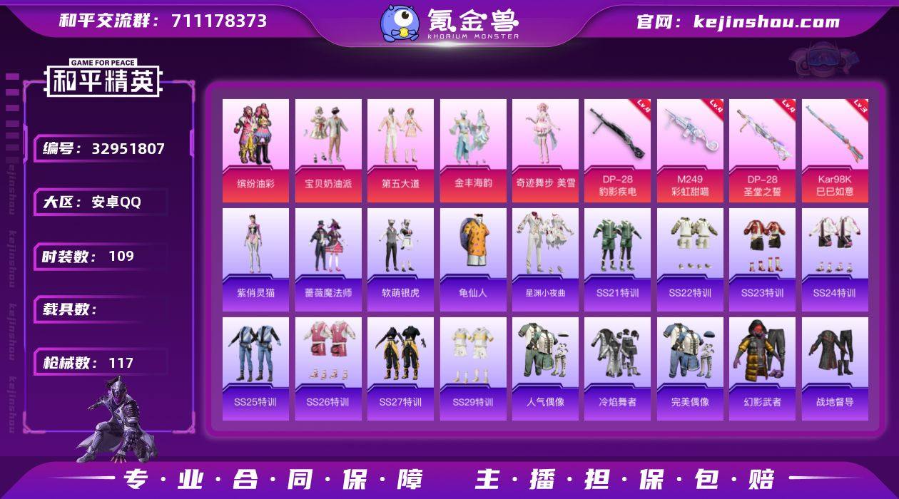 安卓【小号 粉装-宝贝奶油派/粉装-缤纷油彩/套装-龟仙人/Kar98K-巳巳如意(三级)】 手Q-5粉装-5特效枪-0载具-2粉色飞行器-39503热力值-16王牌印记-109套装-117枪皮 【热门品类】:粉装-缤纷油彩,套装-龟仙人 【粉色套装】:粉装-宝贝奶油派,粉装-缤纷油彩,粉装-第五大道,粉装-金丰海韵,角色-奇迹舞步 美雪 【粉色枪皮等级】:Kar98K-巳巳如意(三级),Mk14-福马献瑞(一级),M249-彩虹甜喵(四级),DP-28-圣堂之誓(四级),DP-28-豹影疾电(四级) 【粉色枪皮】:Kar98K-巳巳如意,Mk14-福马献瑞,M249-彩虹甜喵,DP-28-圣堂之誓,DP-28-豹影疾电 【粉色飞行器】:炫彩糖果飞行器,童趣迷兔飞行器 【粉色降落伞】:甜心宝贝降落伞,洛神天依降落伞,垂柳戏鸭降落伞,彩虹甜喵降落伞,甜蜜草莓降落伞,旋转彩虹降落伞,飒粉甜心降落伞,镜域双华降落伞,精灵梦叶罗丽降落伞,异瞳寒姬降落伞,极意拳锋降落伞,炫彩糖果降落伞,罪夜之冕降落伞 【稀有套装】:套装-龟仙人,套装-雪国风尚,套装-炫彩糖果,套装-星渊小夜曲,角色-紫俏灵猫 【稀有枪皮】:AUG-冰晶雪宝,AKM-缤纷海域,SCAR-L-玉兔迎春,SCAR-L-甜蜜誓约,M416-红色方程式,GROZA-懵萌河马,GROZA-田园牧歌,AUG-冰...